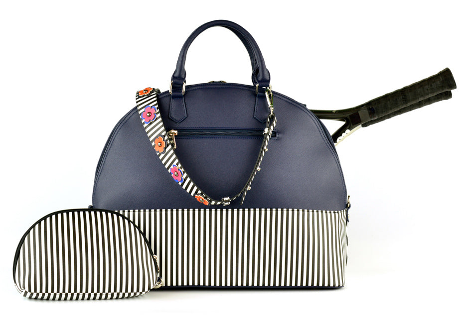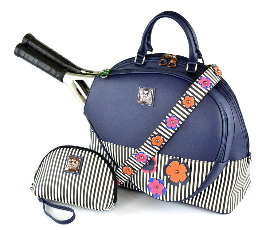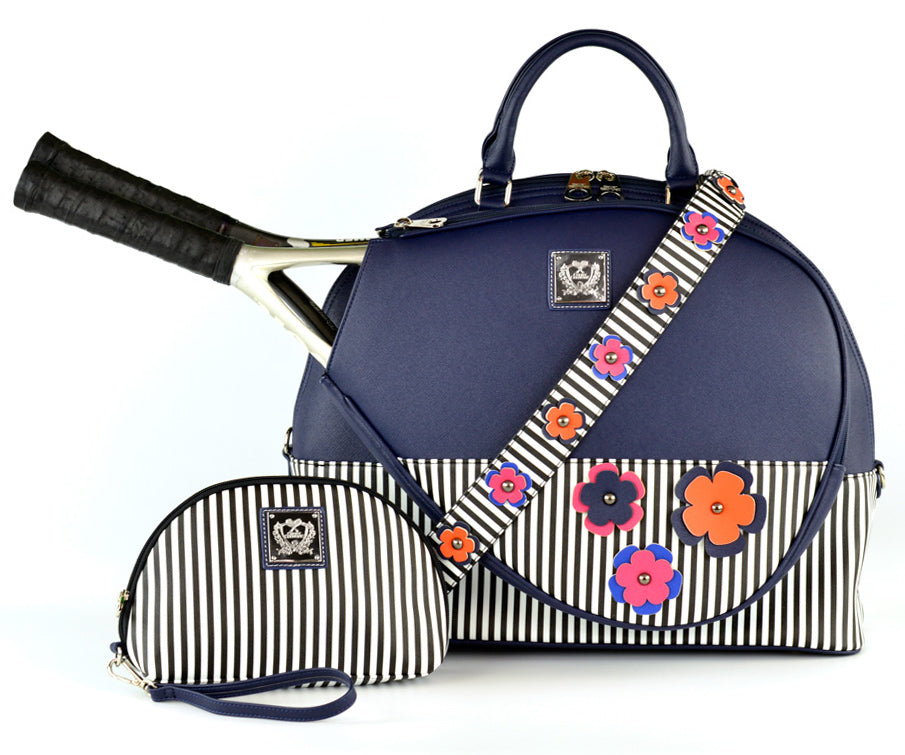 The Court Couture Ella Court Bag features classic stripes teamed with vibrant colors to set the new season. Detachable and adjustable flowers-embelish the adjustable guitar strap. Keep it secure with a double zipper closure.