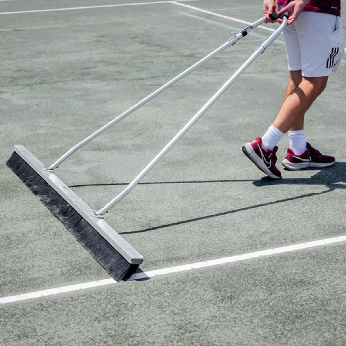 The Har-Tru 6' Clay Court Drag Brush (Hand Model with Fine or Coarse Bristles) is a great tennis court sweeper. This brush has been redesigned to make grooming your court even easier to use, cause less damage to posts, and more affordable to ship. All models are now 6' in length. This drag brush has built-in strength and versatility with replaceable dual 4 1/2" bristles designed to level and manicure your court. Reverse the handle and double the life of the broom. Available in hand or tow models as well as fine or coarse bristles.
