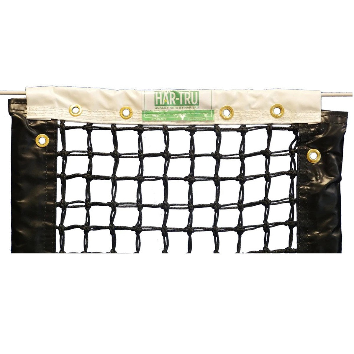 Smaller mesh size - The net bodies on all Har-Tru and Courtmaster tennis nets use 1-23/32” size mesh, as opposed to the industry standard of 1-¾” size mesh. The smaller mesh size guarantees that balls cannot go through the net, even in Top 10 men’s play. These top-of-the-line net bodies are braided polypropylene solid-core yarn, including four models with hand-woven double top six netting. The top 6 rows of a net receive the most use and abuse, therefore the double mesh netting adds to the longevity of the net. The braided knots are heat set to assure no knot slippage, and the mesh holds its shape in all circumstances.Heavy-duty sidebands - All Har-Tru and Courtmaster tennis nets come with 5/8” fiberglass dowel side stakes. Sidebands utilize 3” wide, 18 oz. non-glare black vinyl, which is folded under on both side edges for a tidy, clean-cut look. No other net supplier folds its sidebands under. Many tennis net manufacturers use 14 oz. vinyl sidebands and are anywhere from 2 ¼” to 2 ½” wide. Har-Tru and Courtmaster’s are 3” wide. They feature two rows of black polyester thread (the same quality as used in the headbands), lock-stitched on our sidebands.