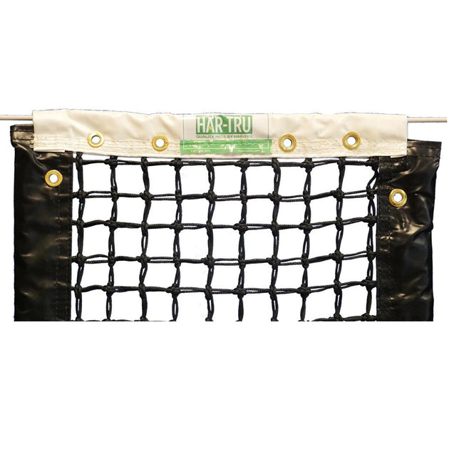 The braided solid-core, black polyethylene net body of the Tidy-fit tennis net and the Revolution tennis net, is U.V. resistant treated for a durable net and the knots are heat-set for a longer lasting shape. All Courtmaster Tennis Equipment products have nets that are protected by a five year warranty. Courtmaster net headbands are quadruple stitched with an extra-duty polyester thread for the longest lasting, abrasion resistant headband on the market. The 3 inch wide side band and the 1 inch bottom bands are made from their thickest vinyl (18 inch) and lock stitched with two rows of black polyester thread for a sleek and professional looking net.