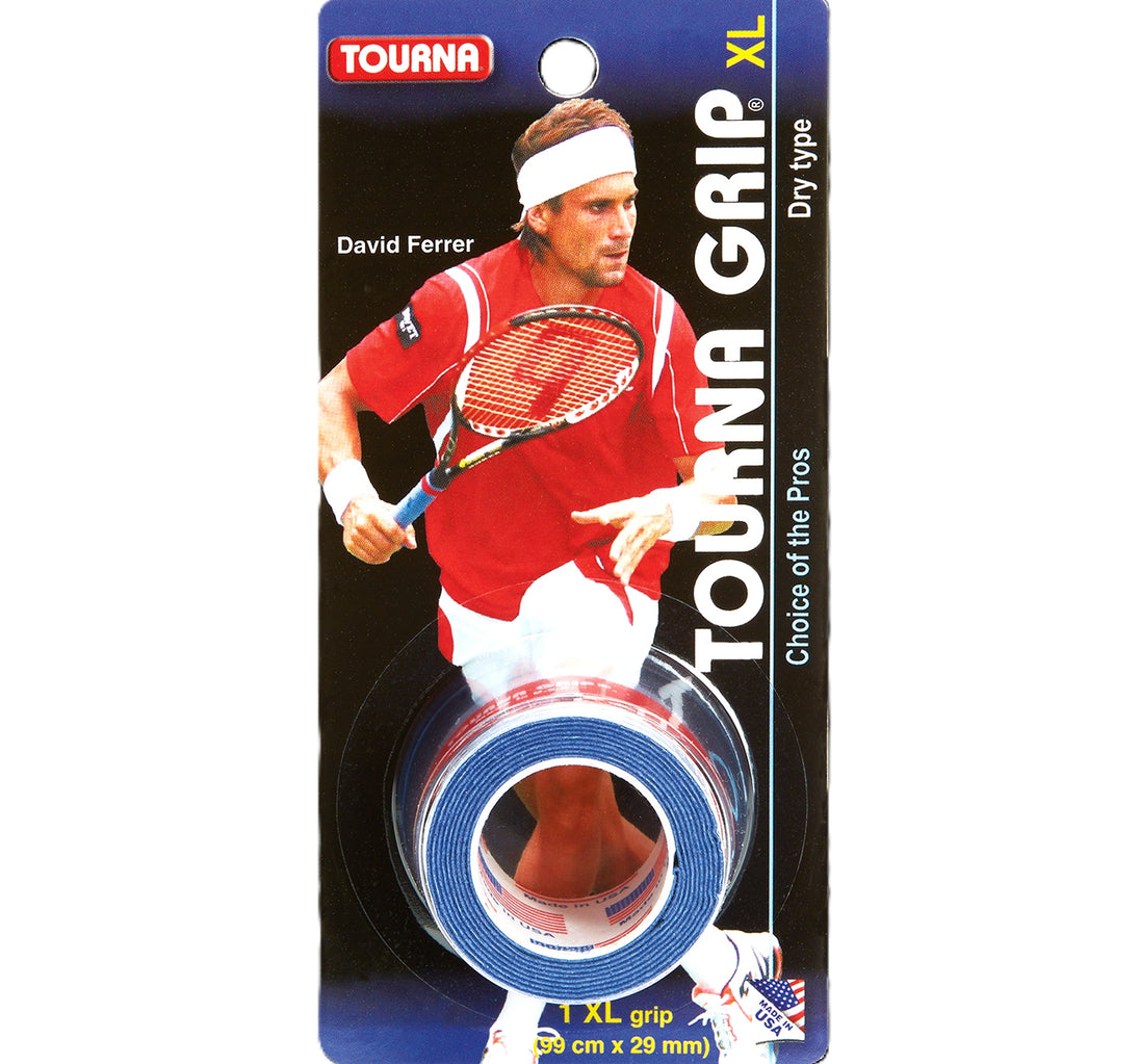 The Tourna Grip XL Overgrip 1-Pack replaces your old grip. This tennis racquet grip has super cushioning that absorbs shock and eliminates need for gloves. Prevents blisters. Perforated to better absorb perspiration. Adhesive on back for quick and secure application. Color: Blue.