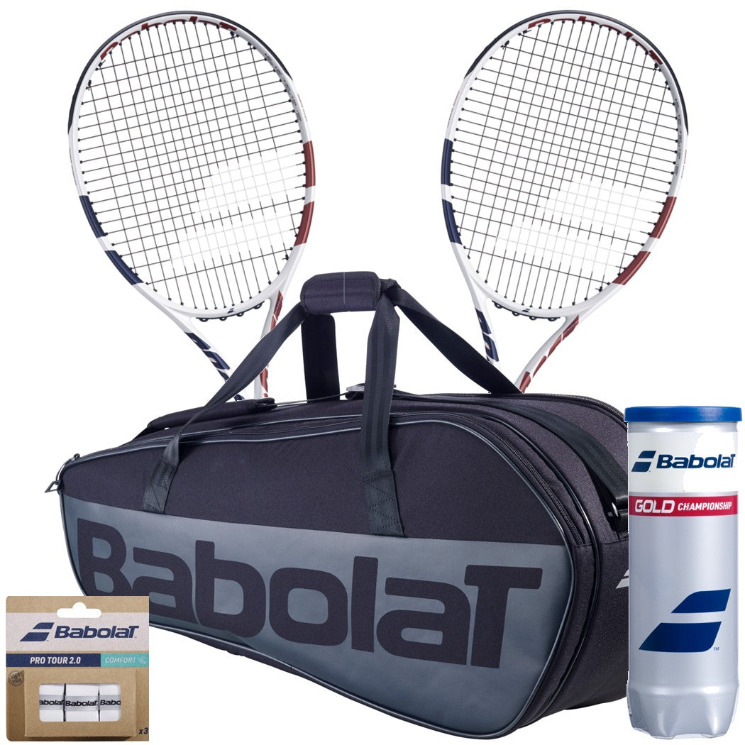 This recreational tennis doubles player pack includes (2) Babolat Boost Drive Strung Tennis Racquets (White) in your choice of grip size, (1) Babolat Evo Court M x6 Tennis Racquet Bag (Black), (1) Babolat Gold Championship Tennis Balls – Can (3 Balls), and (1) Babolat Pro Tour 2.0 Comfort Overgrip 3-Pack (White).