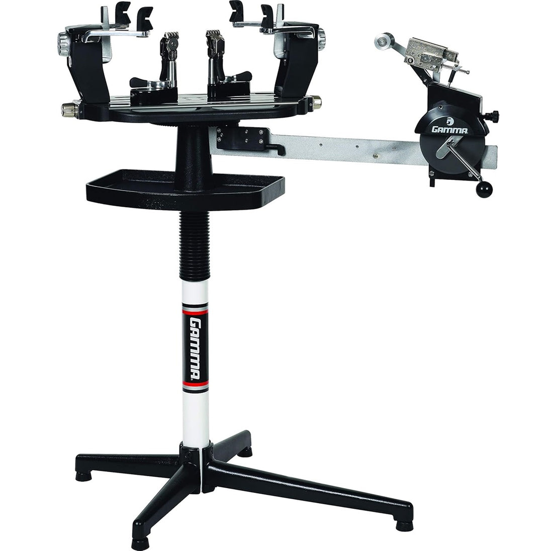 The Gamma 5003 6 PT Quick Mount Stringing Machine has a manual spring tension winder and comes with a floor stand. This machine has a 6 Point Quick Mount System with universal string clamps providing adequate clamping pressure for both tennis and badminton with teeth space optimized for all racquet types. The purchase of this machine also includes tool set, custom machine cover and 5 year warranty.