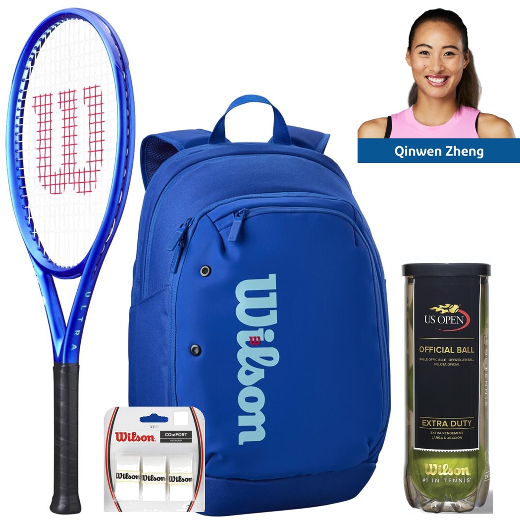 The Qinwen Zheng Pro Player Junior Gear Bundle is crafted for young tennis players who are ready to train hard, play smart, and follow in Qinwen’s footsteps with confidence. Featuring the powerful Wilson Ultra 26 Inch v5 Junior Tennis Racquet, a stylish and functional Ultra v5 Tour Tennis Backpack in Blue, and premium Wilson accessories, this performance-focused set equips juniors with everything they need to improve their skills and feel inspired on the court. Designed for aspiring players who demand quality and innovation, this bundle blends pro-level performance with sustainable choices.