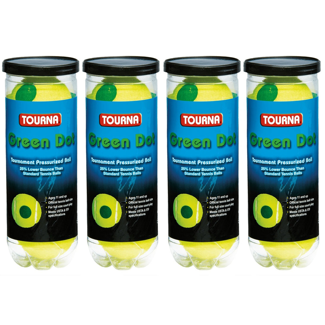Meets ITF stage 1 and USTA specificationsThe Tourna Youth Green Dot Tennis Balls - 4 Cans (12 Balls) has 12 balls with low compression help kids learn tennis at an early age by promoting long, full strokes, and with a height appropriate bounce.