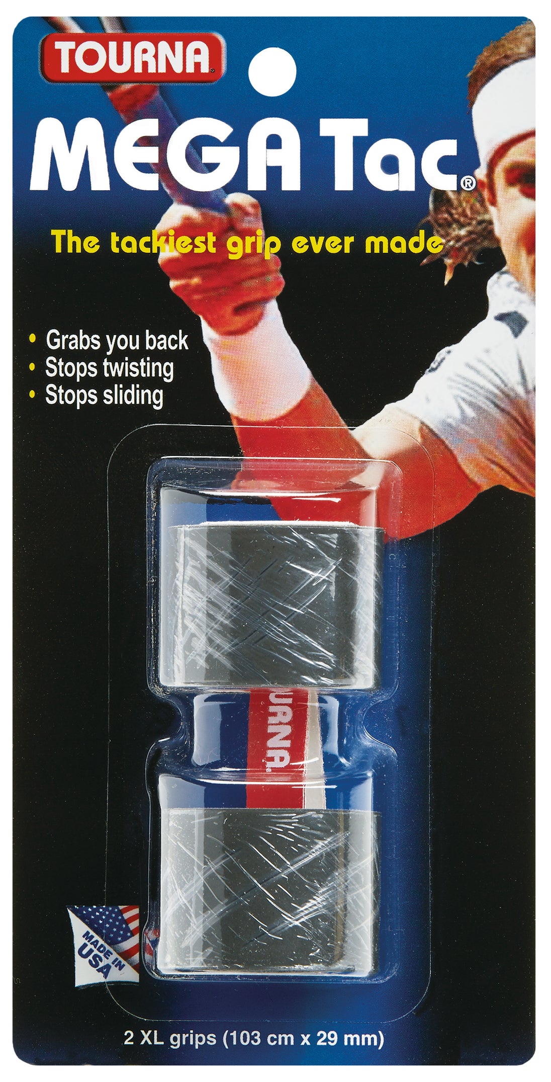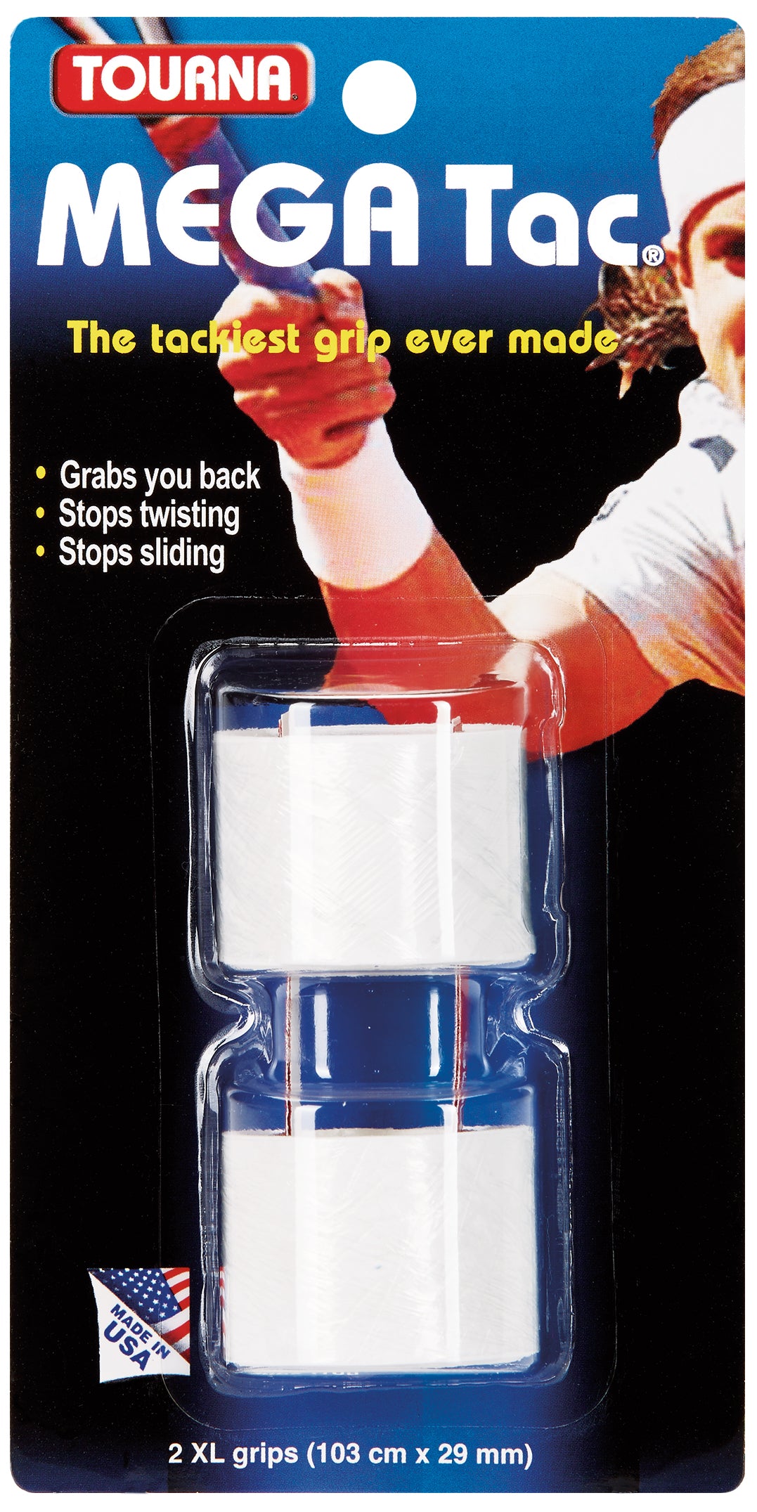 According to Tourna, Mega Tac is the tackiest overgrip ever made, period. An exclusive polyurethane coating creates an ultra tacky surface that literally clings to your hand. Tourna also promises a very long tack time, with Tourna reporting tackiness for up to 14 hours. Tourna designed Mega Tac for players who prefer a durable, tacky grip, that works even in cold weather.