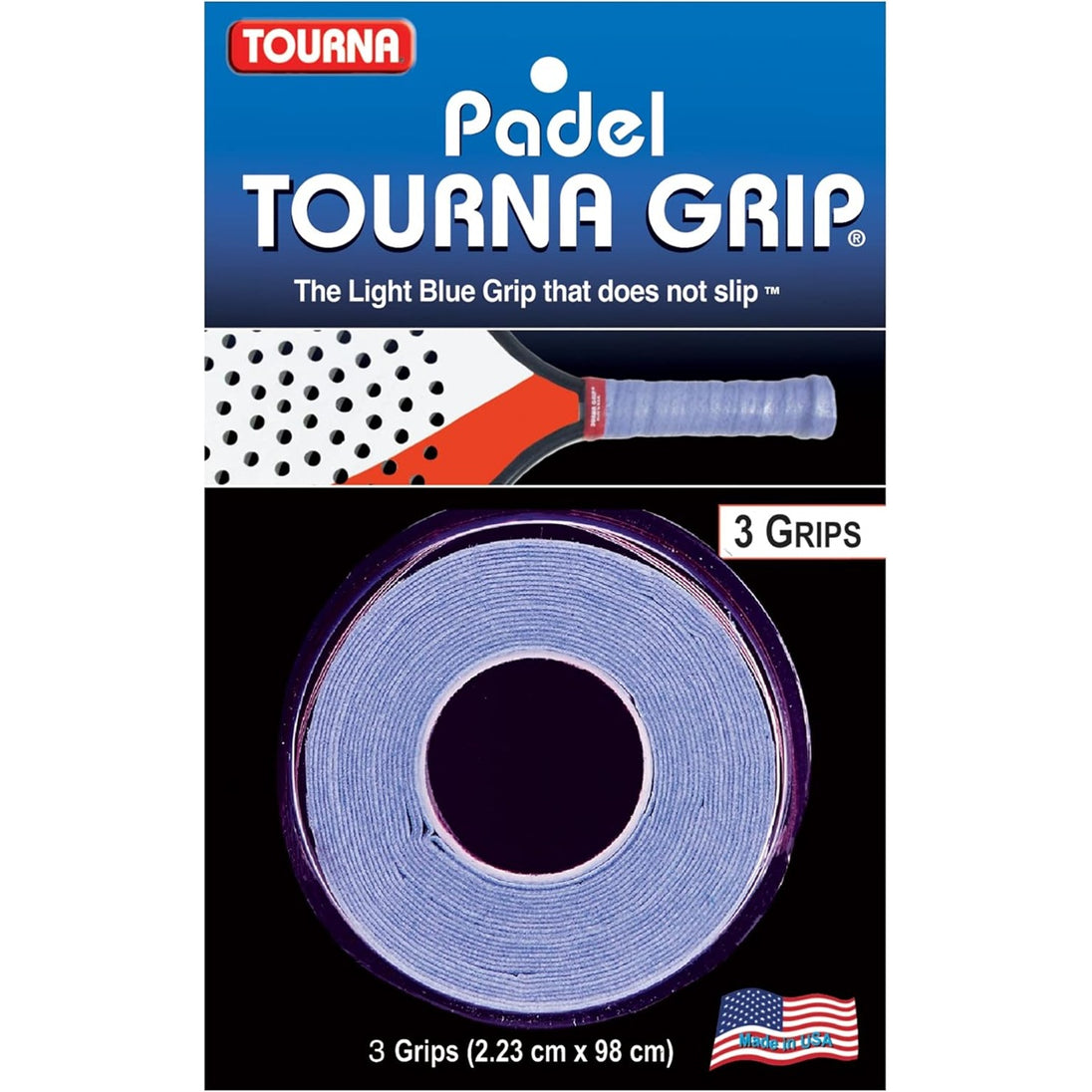Trademarked Light Blue Color.The Tourna Padel Replacement Grip is the gold standard for sweat absorption and the only grip that gets tackier when wet.