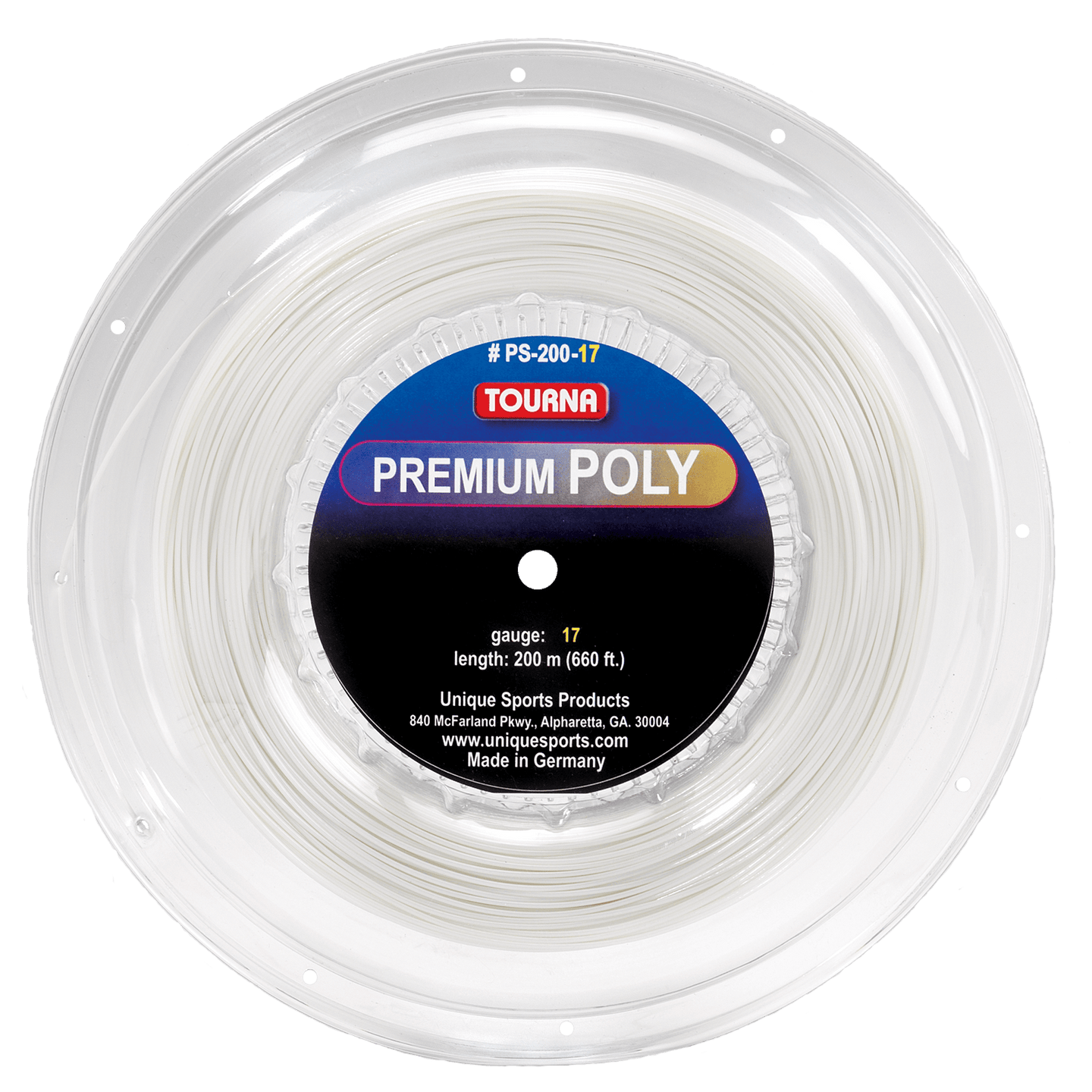 17g, 660 ft (200 m) reelThe Tourna Premium Poly 17g Tennis String (Reel) is designed especially for heavy top spin hitters.