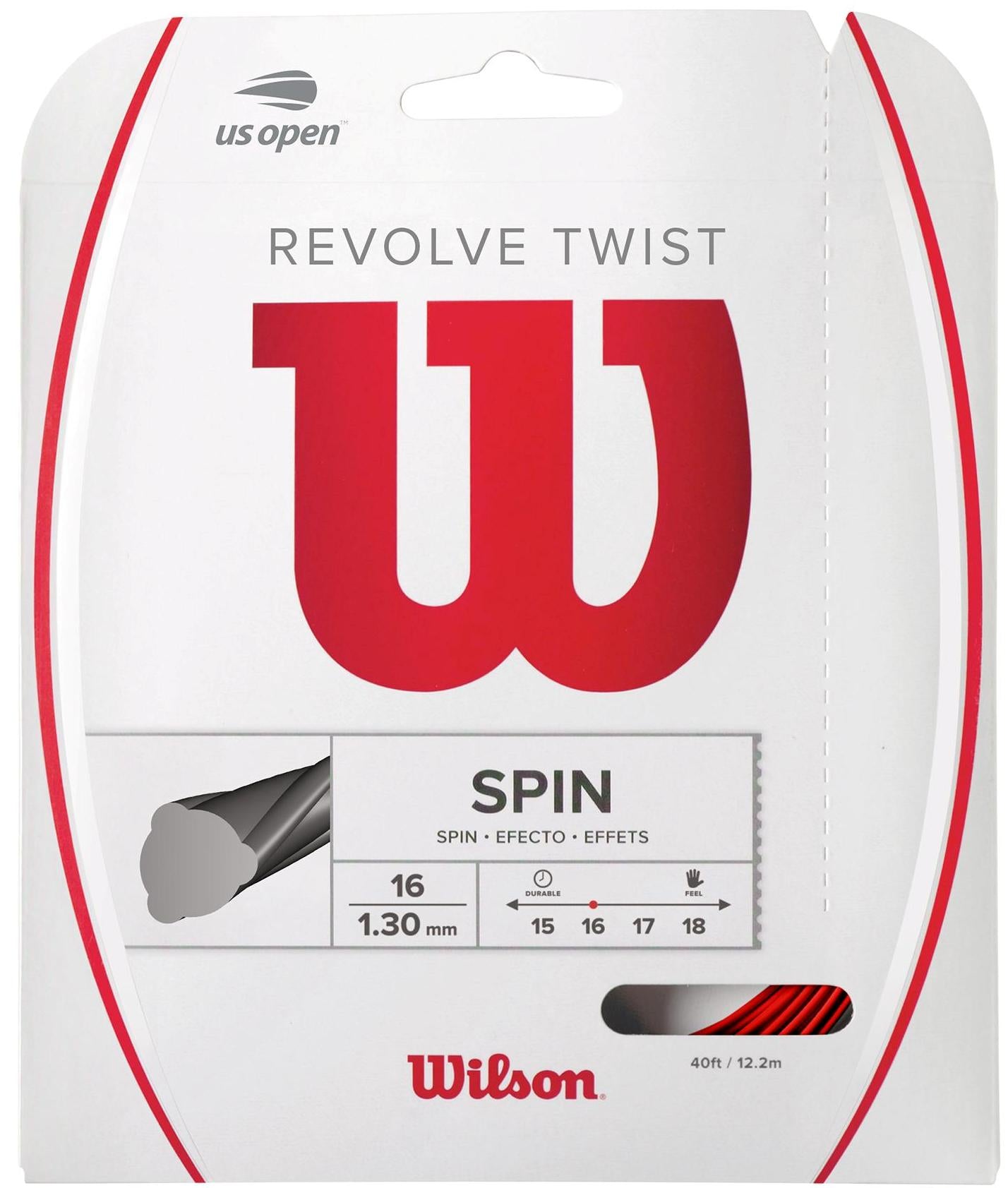 Wilson added an extra twist to their Revolve line with the super-spin generating Revolve Twist 16g co-polyester monofilament tennis racket string.