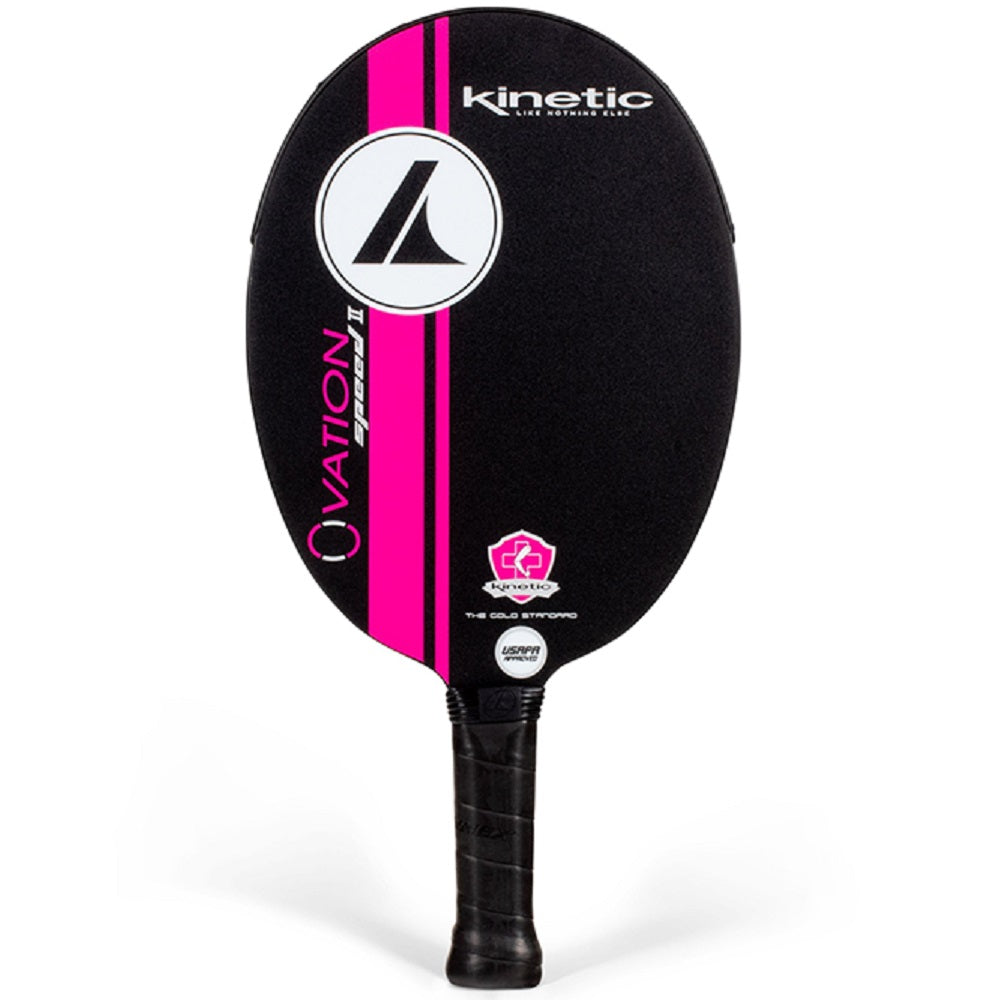The Pro Kennex Ovation Speed 2.0 Pickleball Paddle (Black) has been designed by Pro Kennex engineers using the physics of shape design to elevate paddle performance with an expanded sweet spot and a more efficient energy transfer. The new modified oval shape creates one of nature’s strongest designs, bringing a higher percentage of paddle mass along the center axis. Players looking for a competitive advantage in their equipment will immediately notice an increase in paddle maneuverability and speed.