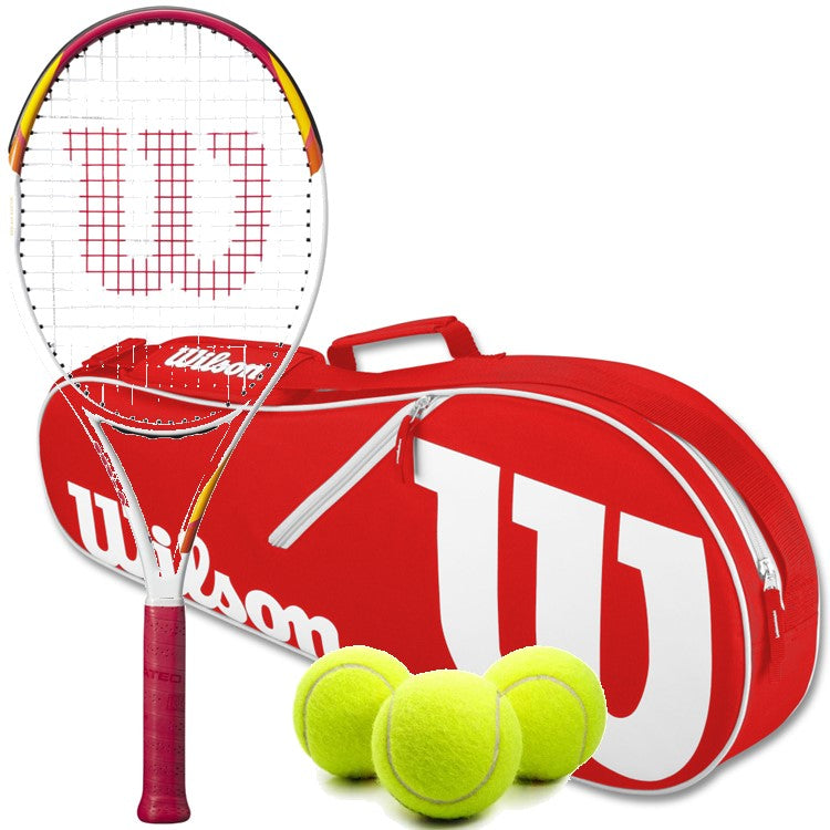 This tennis starter set includes (1) Wilson Six One Tennis Racquet in your choice of grip size, (1) Advantage II Tennis Bag (Red), and (3) tennis balls.