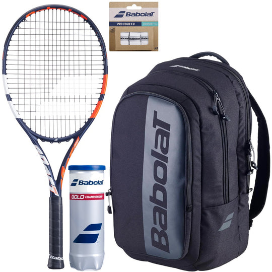 Babolat Bundles Options include Boost Drive and Boost Strike racquets with graphite construction for lightweight power and control. Bundles often come with the Babolat Evo Court Hero Backpack, ITF/USTA-approved Babolat Gold Championship Balls, and Pro Tour Overgrips, giving players a professional starter pack in one purchase.