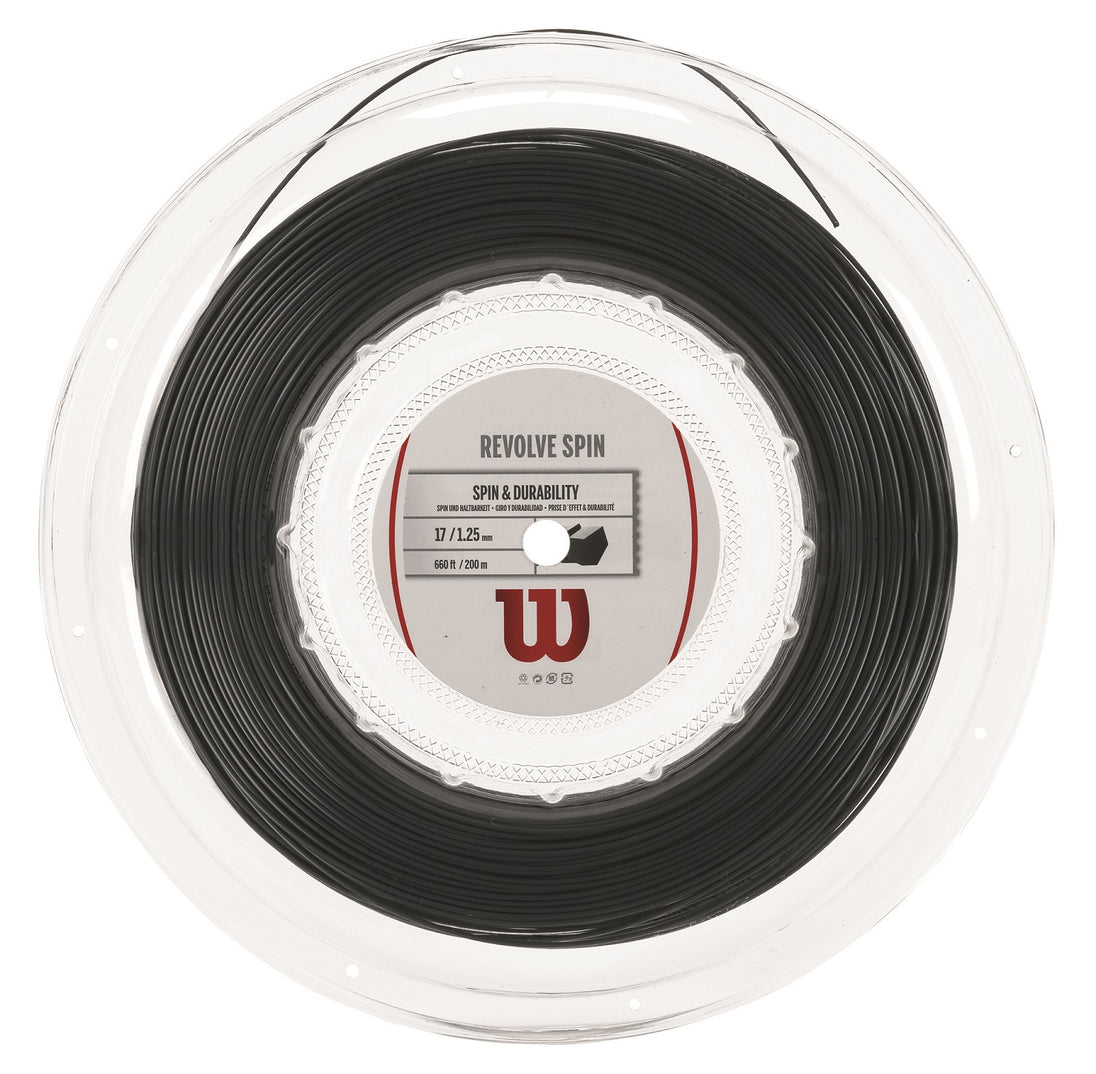 The Wilson Revolve Spin 17g Black Tennis String (Reel) is comprised of Crosslink Ester Polymer and UHMW. Now featuring an edged shape, Revolve Spin offers exceptional spin while maintaining comfort and power.