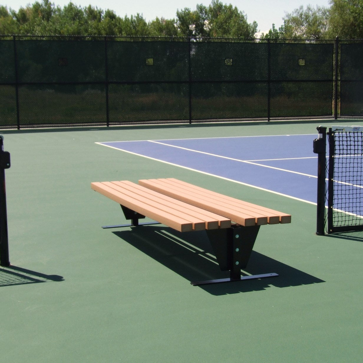 The SunTrends 4 ft Flat Two Sided Tennis Court Bench (Black) mounts directly to the court surface for simple installation.