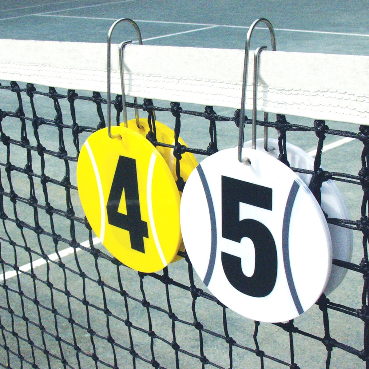 The Tourna Portable Tennis Score Keeper includes durable numbers 0 to 9 to keep track of the tennis match score using clips that attach to the net. This easy to use scoring system comes in a convenient carrying bag.