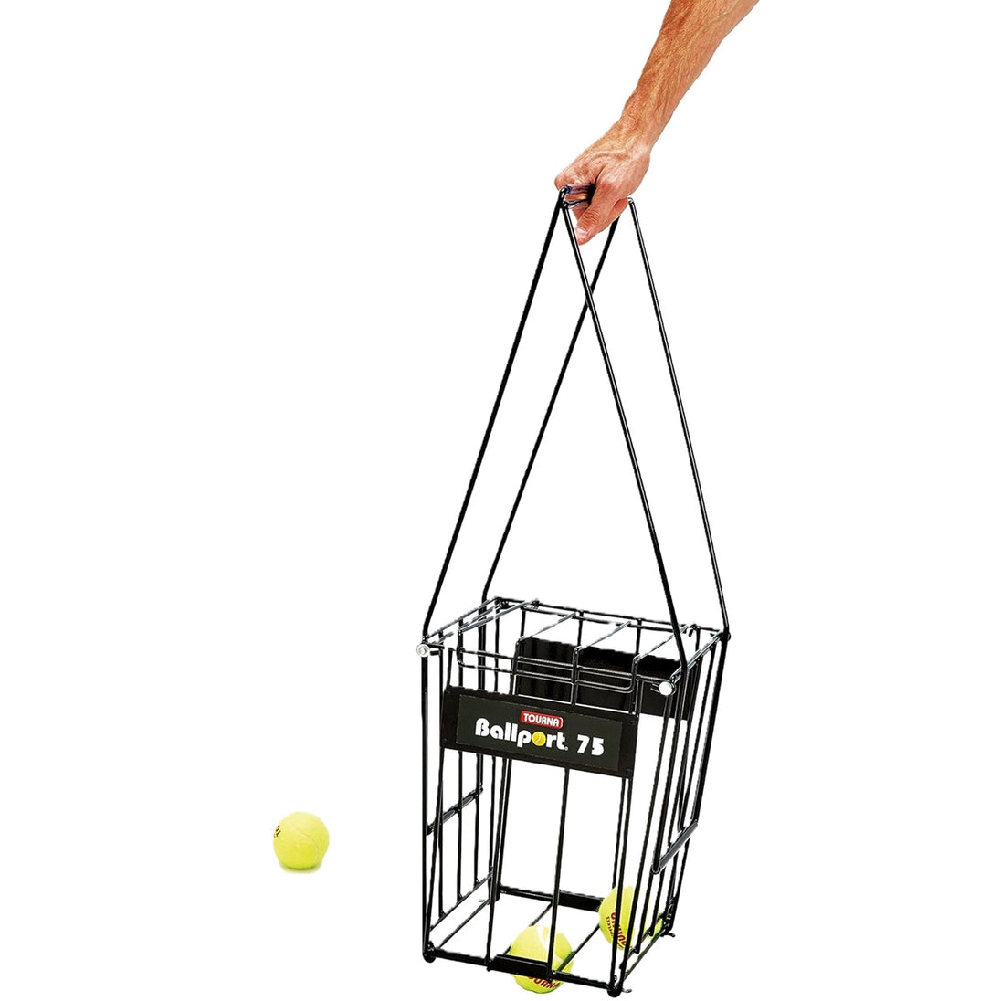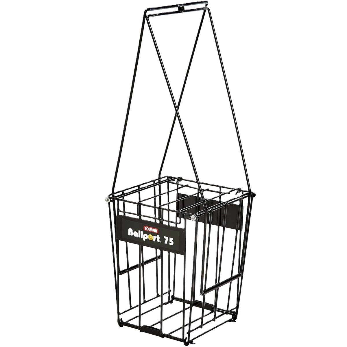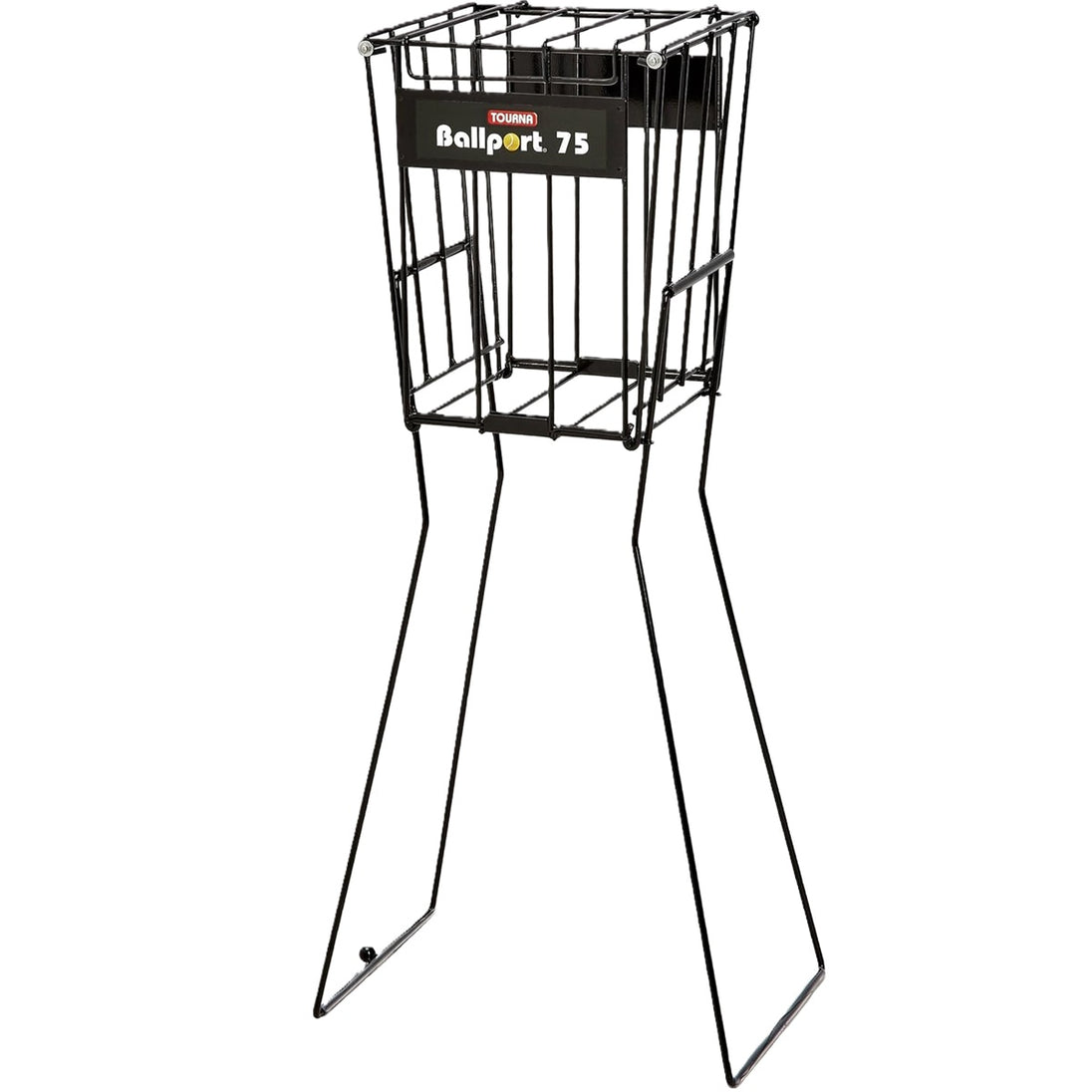 The Tourna Ballport 75-Ball Tennis Ball Hopper securely holds and picks up 75 standard tennis balls. The handles can be reversed and locked to stand up as a basket during practice.