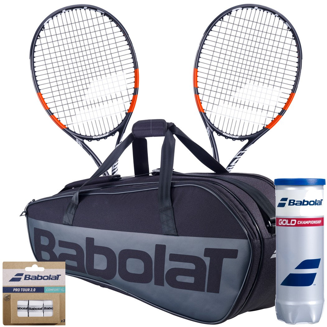 This recreational tennis doubles player pack includes (2) Babolat Boost Strike Tennis Racquets (4th Gen) in your choice of grip size, (1) Babolat Evo Court M x6 Tennis Racquet Bag (Black), (1) Babolat Gold Championship Tennis Balls – Can (3 Balls), and (1) Babolat Pro Tour 2.0 Comfort Overgrip 3-Pack (White).