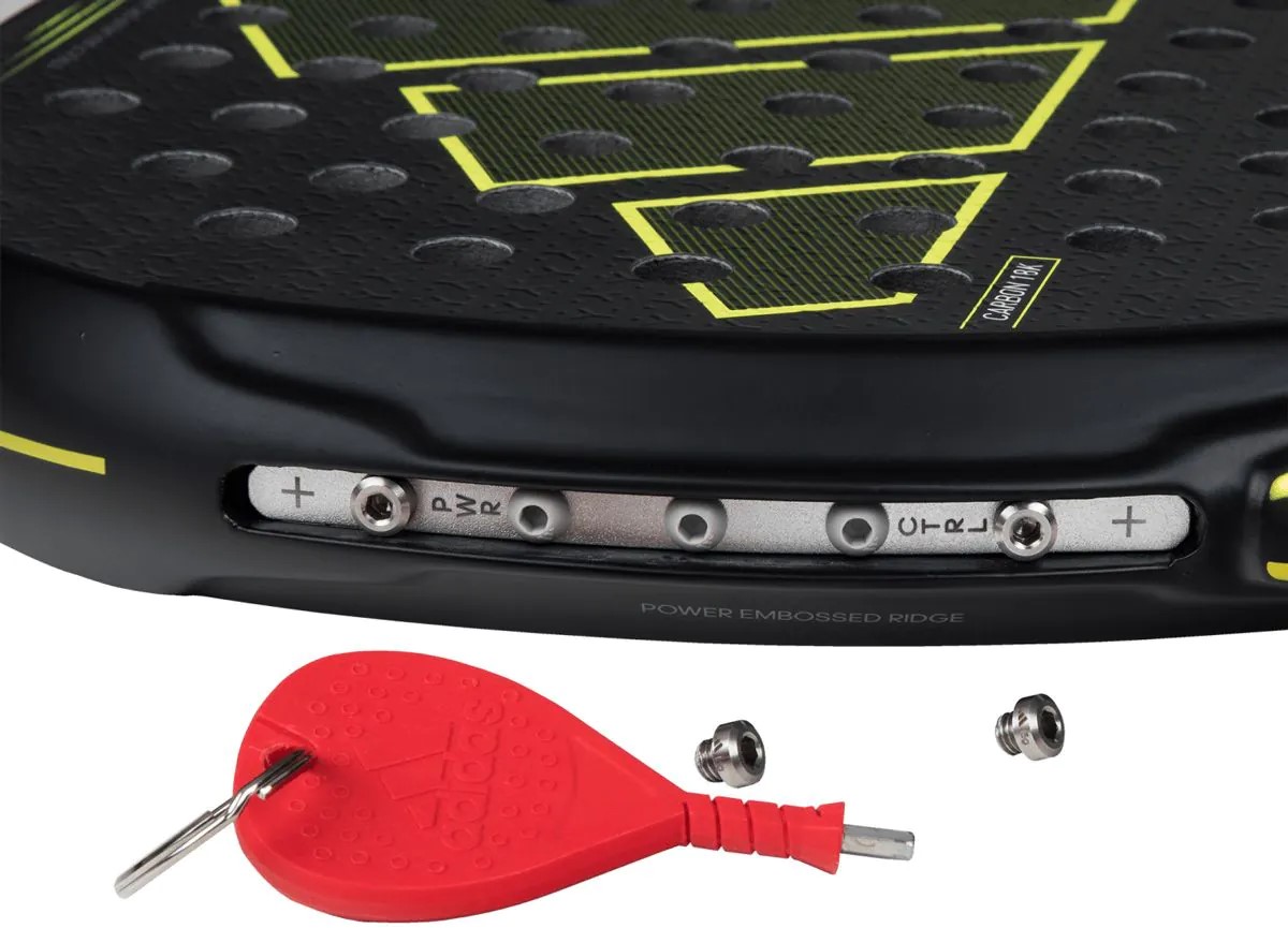 The Adidas Adipower Mulitweight 3.3 Padel Racket (Black/Yellow) features a Weight & Balance System Multiweight. The weighting system allows you to modify the weight and balance by removing or adding up to 9 grams distributed among 7 screws, adapting the balance to your needs. Materials include 18k carbon fiber, with braided carbon fiber strands for strength, durability, and hardness as well as High Memory EVA rubber that increases power on high speed shots.