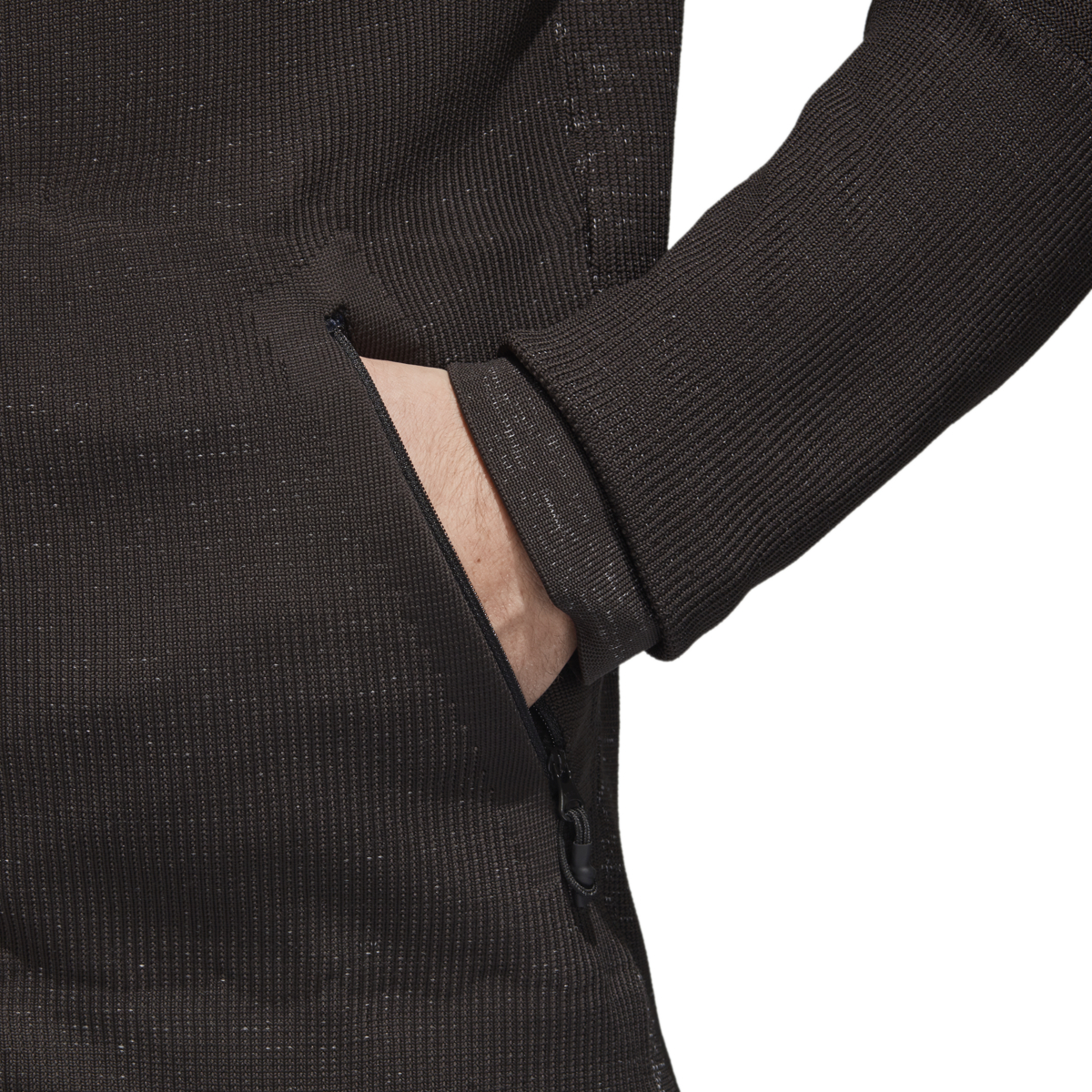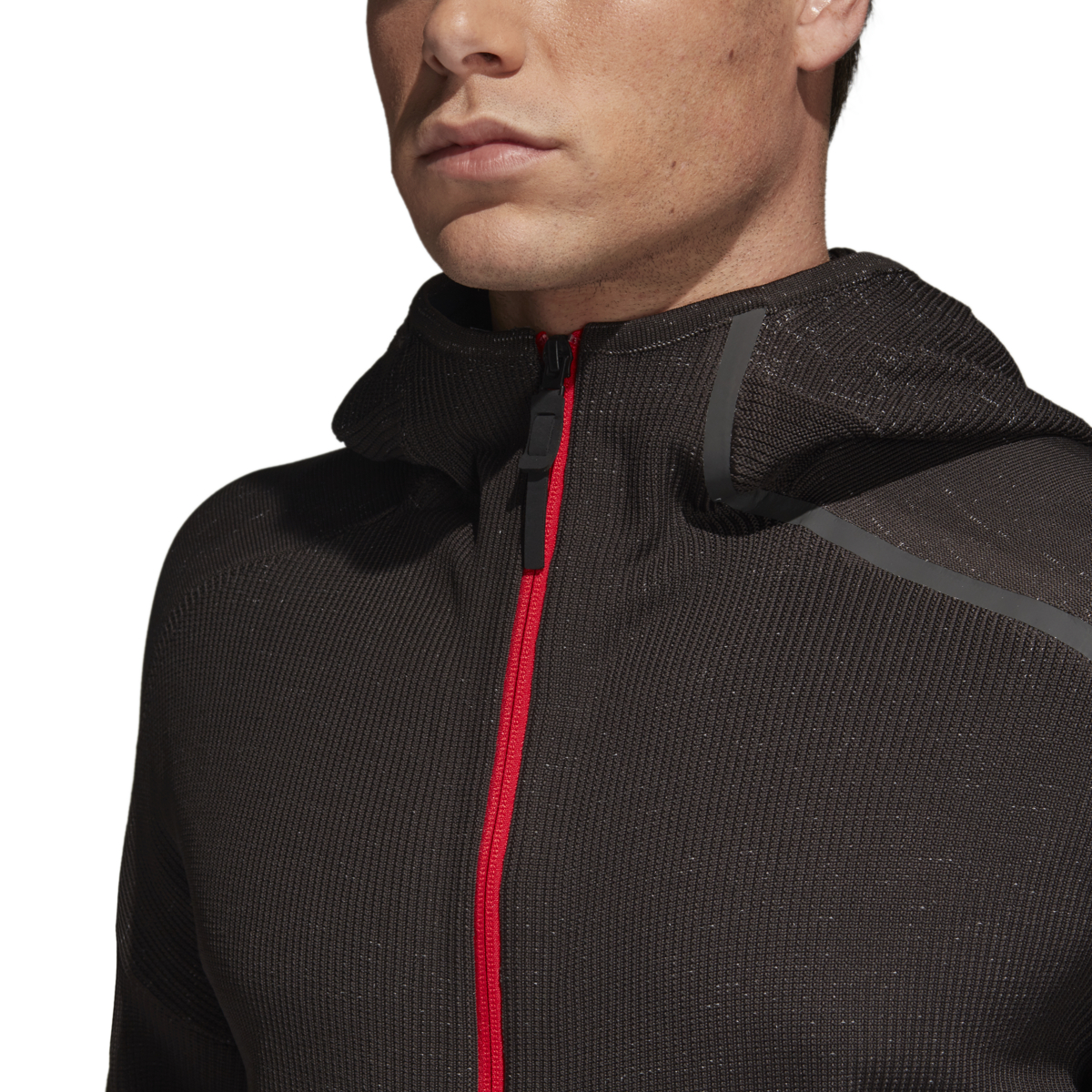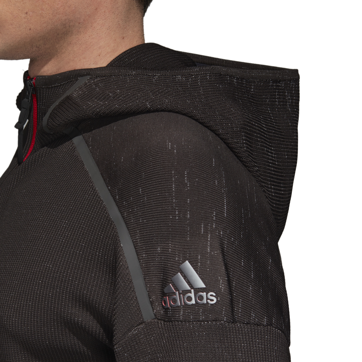 Front zip pockets; Full zip with hood; Contrast color on zip and taping; Contrast knit on cuffs and curved hem; Strategically placed knit zones for optimal breathability and range of motion; adidas Z.N.E. line print on shoulder; adidas Badge of Sport on sleeve