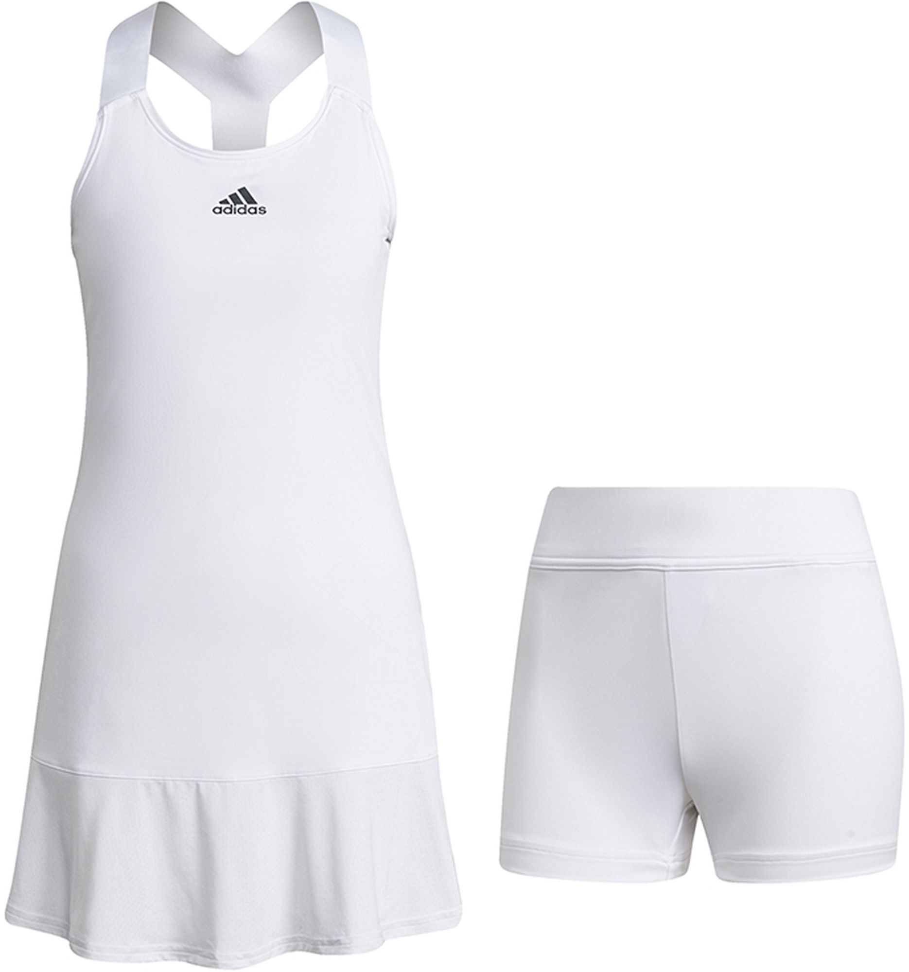 The Adidas Women’s Standard Tennis Y-Dress (White/Black) created to help you own the court. The single-piece Y-shaped strap on this adidas tennis dress is precisely positioned to free your arms. Moisture-wicking AEROREADY and soft fabric that stretches with every lunge and slide combine to keep you in charge. Snug at the top, this dress flares into a flattering A-shape, while separate short tights give you full coverage.