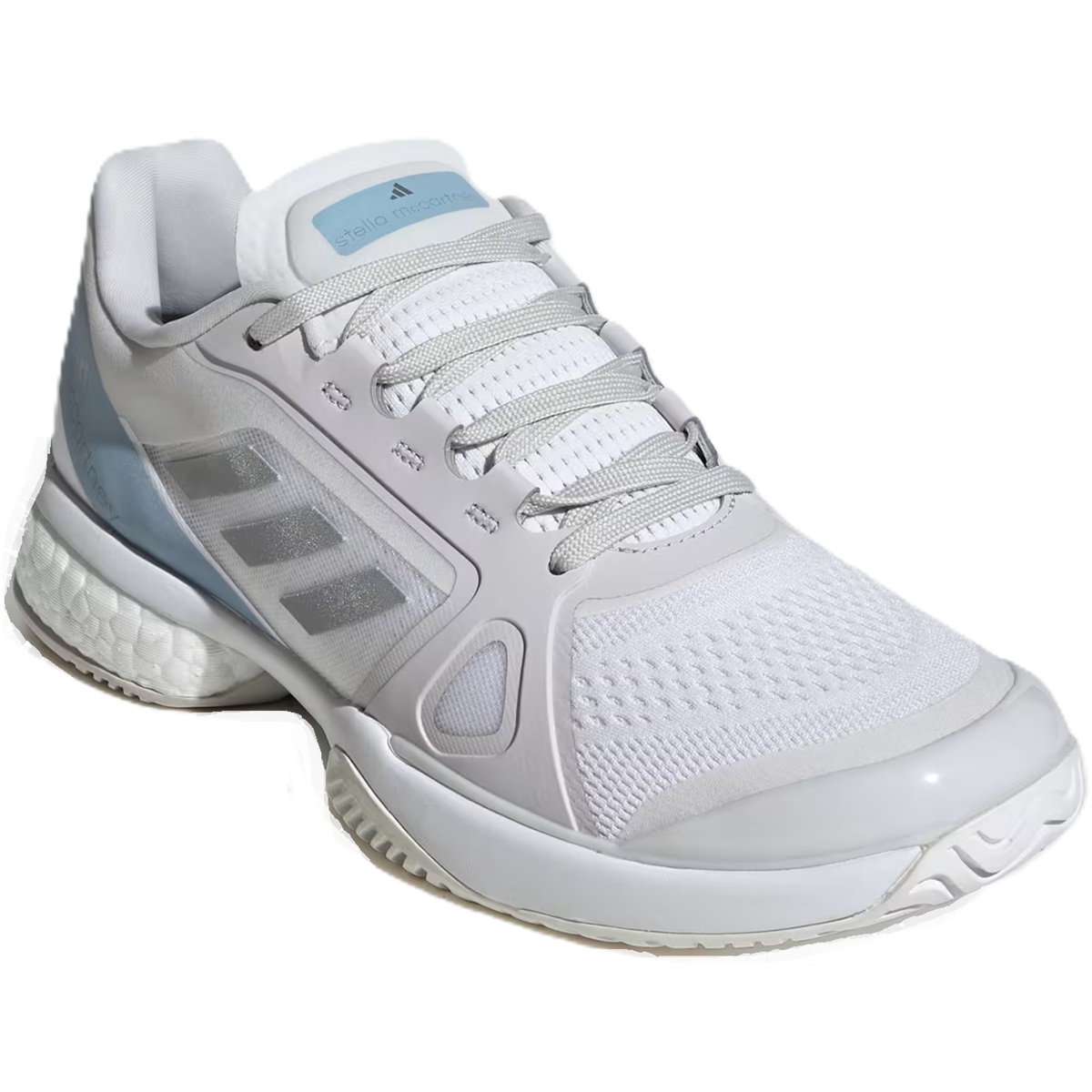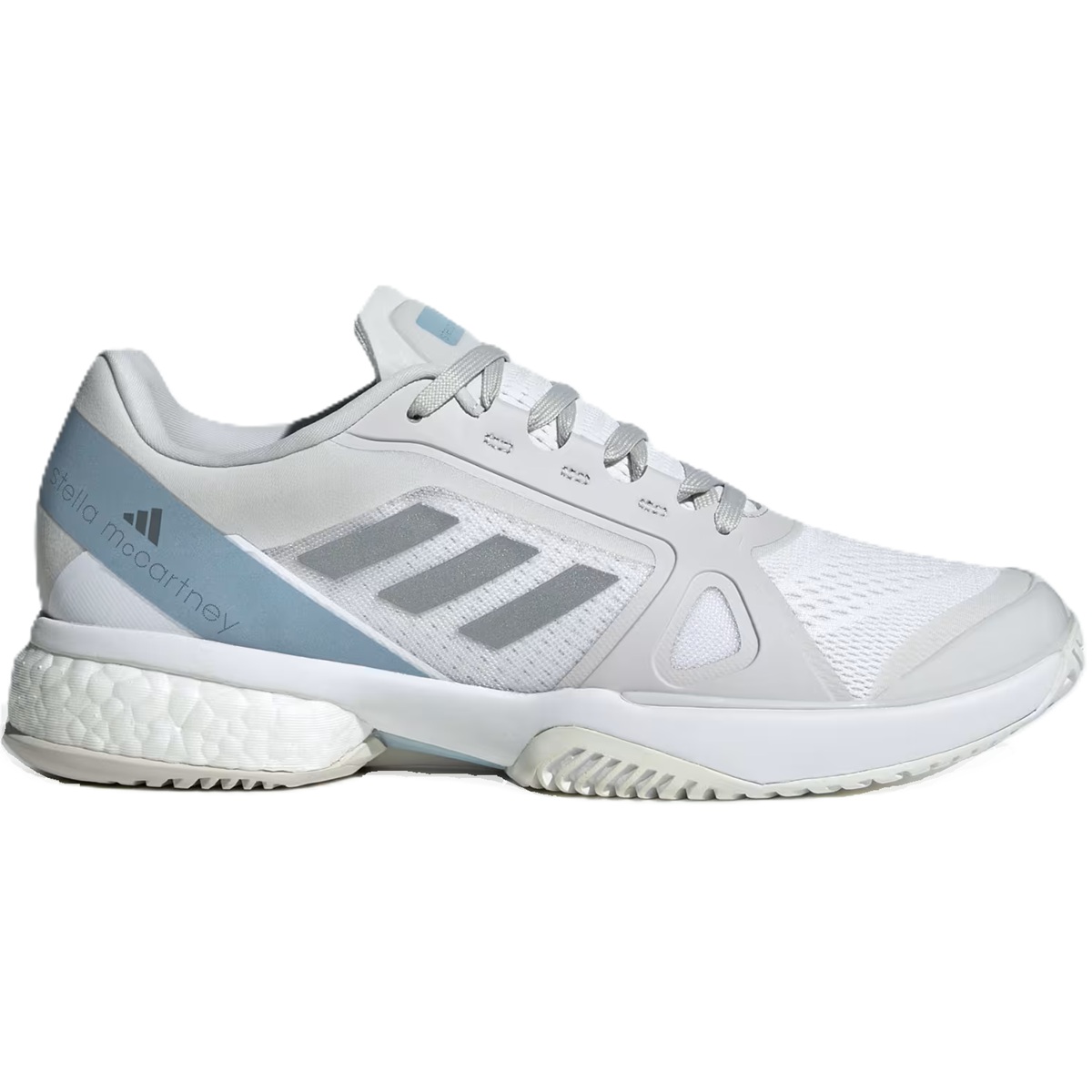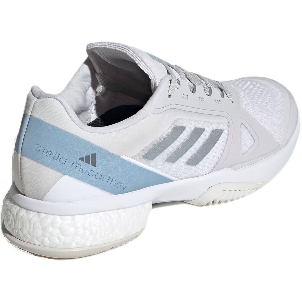 The Adidas Women's Stella McCartney Court Tennis Shoes (White/Silver Metallic/Wonder Blue) give you elite performance that meets on-court style. Flashing a bold Stella McCartney design, these Adidas tennis shoes will keep you flying with an energy-returning BOOST midsole. On top, reflective details catch the eye while durable overlays work hard to defend the breathable mono mesh upper from foot-drag abrasion. Underneath, a grippy outsole keeps your reactions quick.