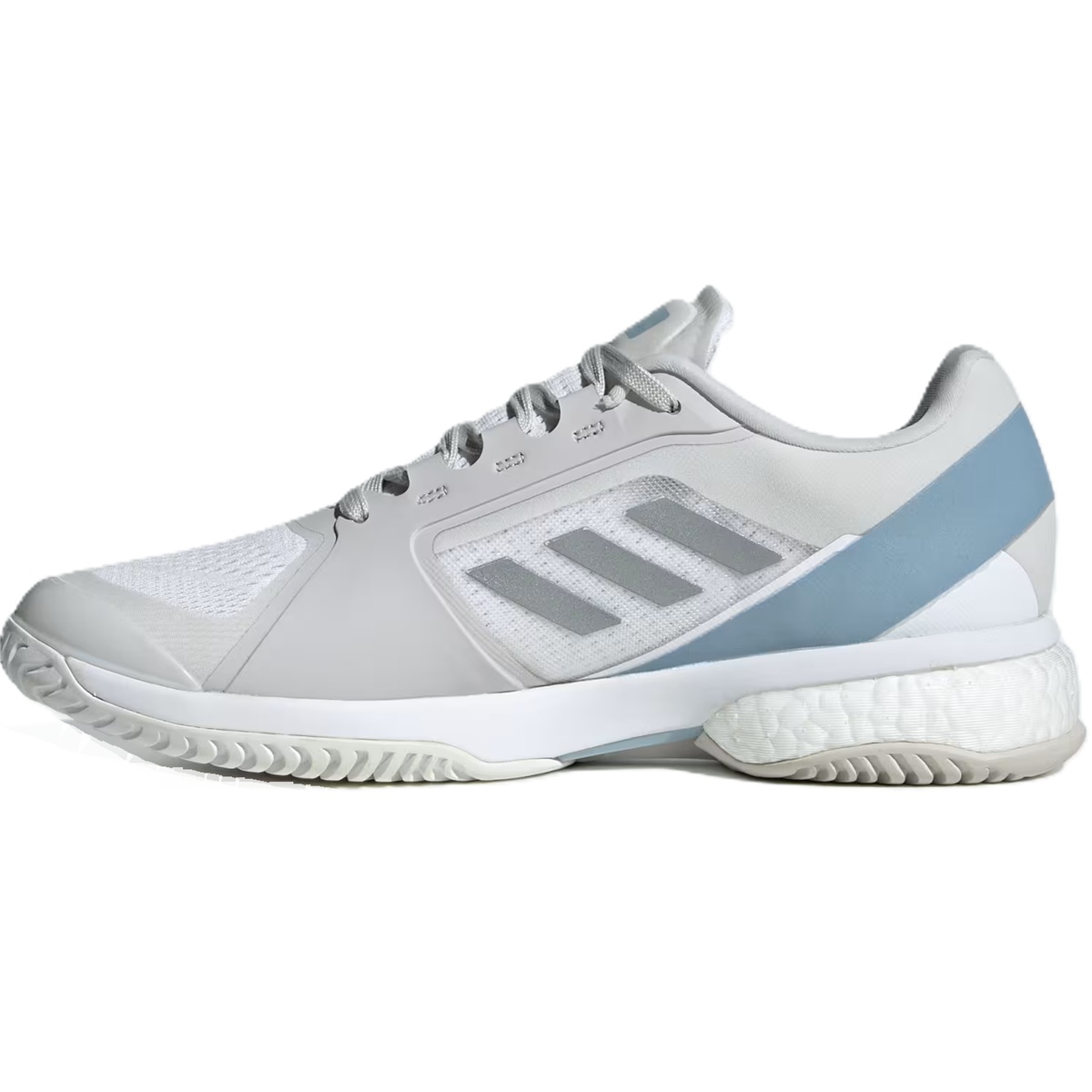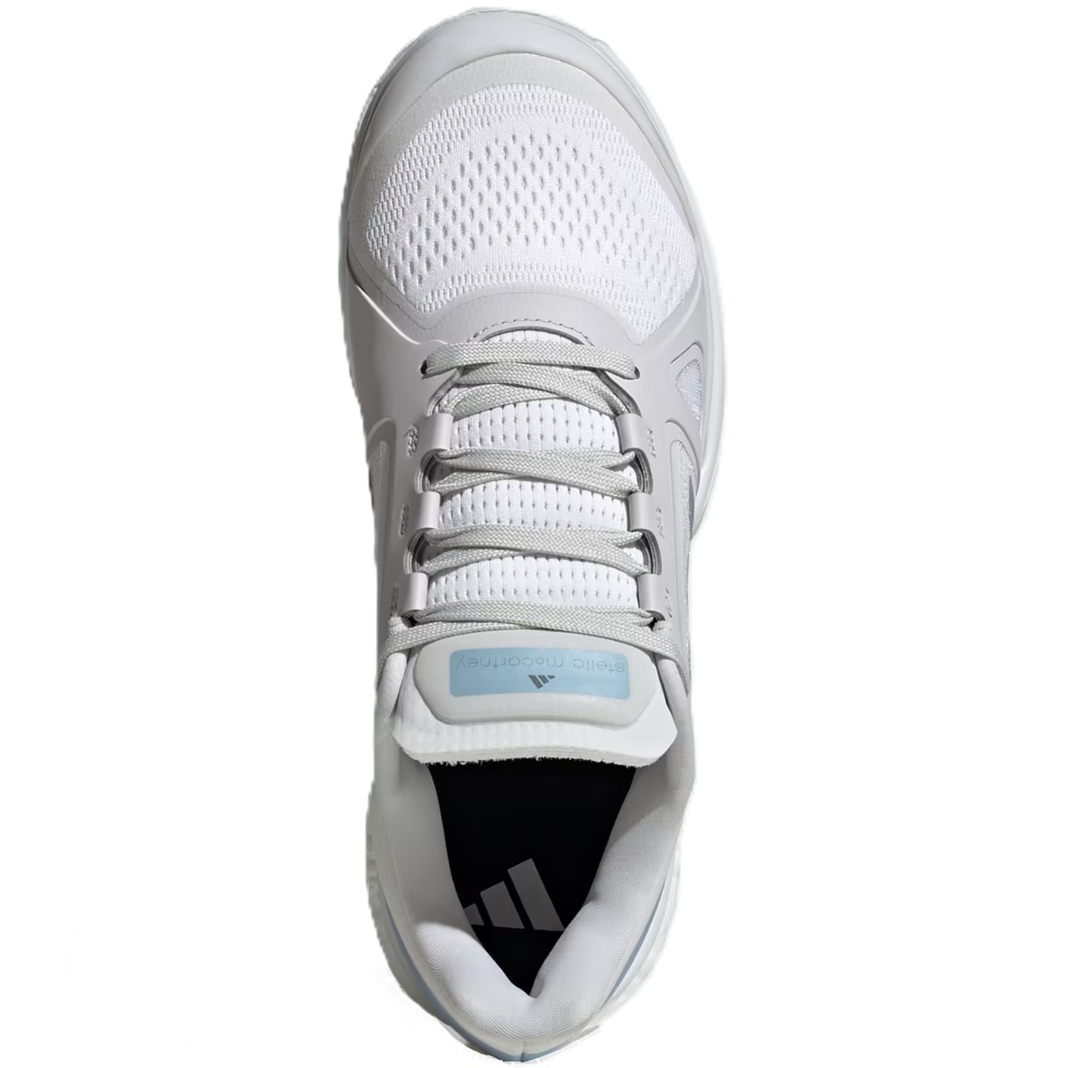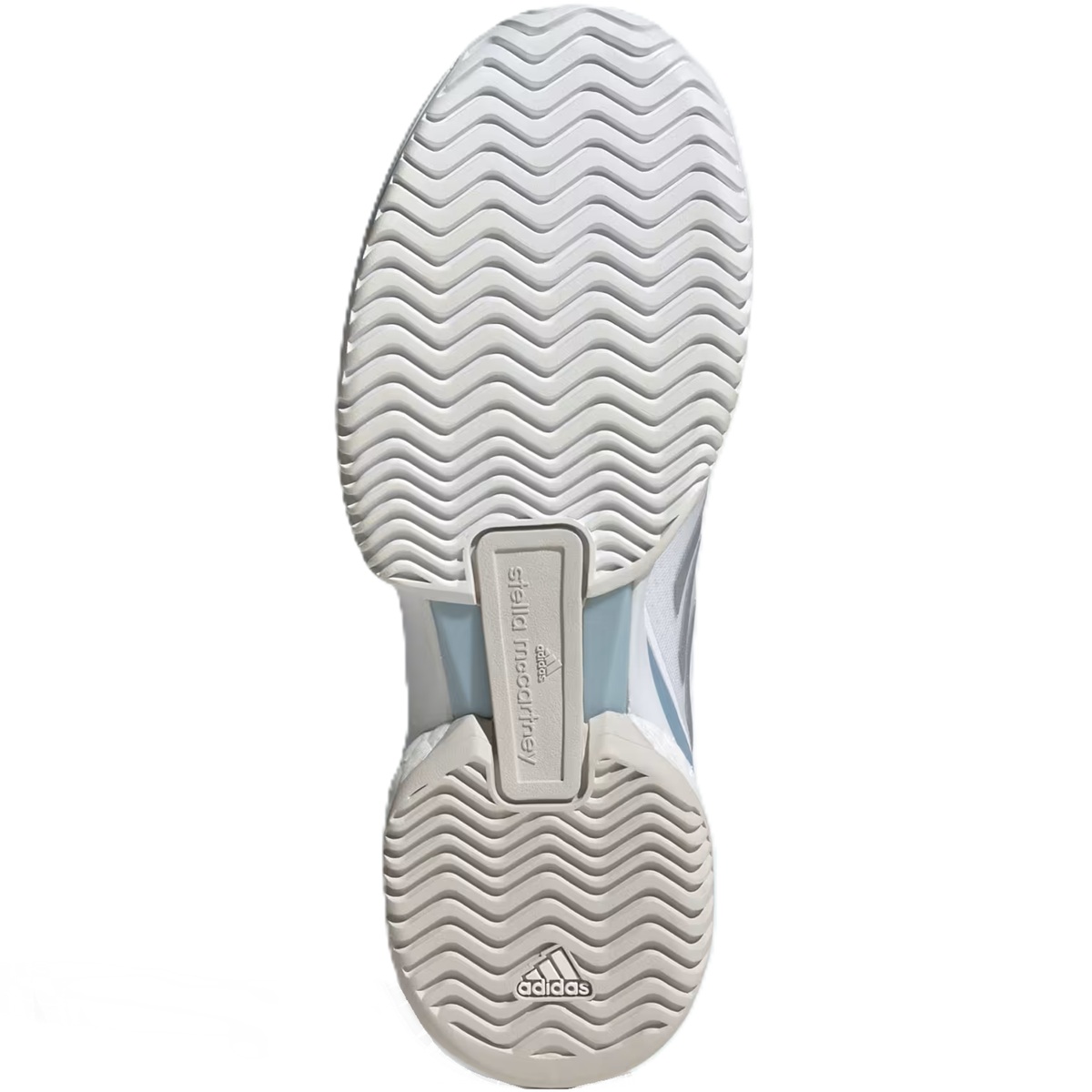 The Adidas Women's Stella McCartney Court Tennis Shoes (White/Silver Metallic/Wonder Blue) give you elite performance that meets on-court style. Flashing a bold Stella McCartney design, these Adidas tennis shoes will keep you flying with an energy-returning BOOST midsole. On top, reflective details catch the eye while durable overlays work hard to defend the breathable mono mesh upper from foot-drag abrasion. Underneath, a grippy outsole keeps your reactions quick.