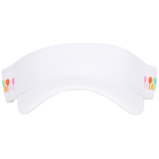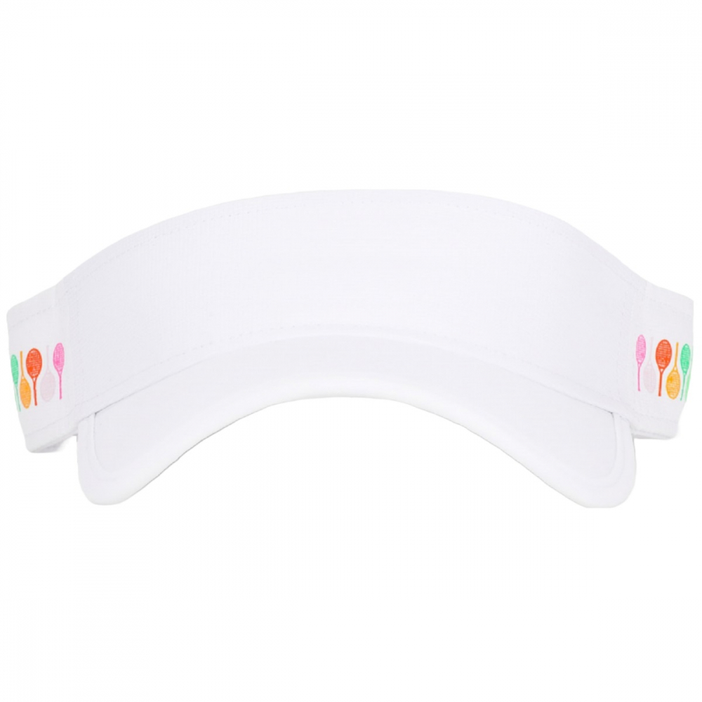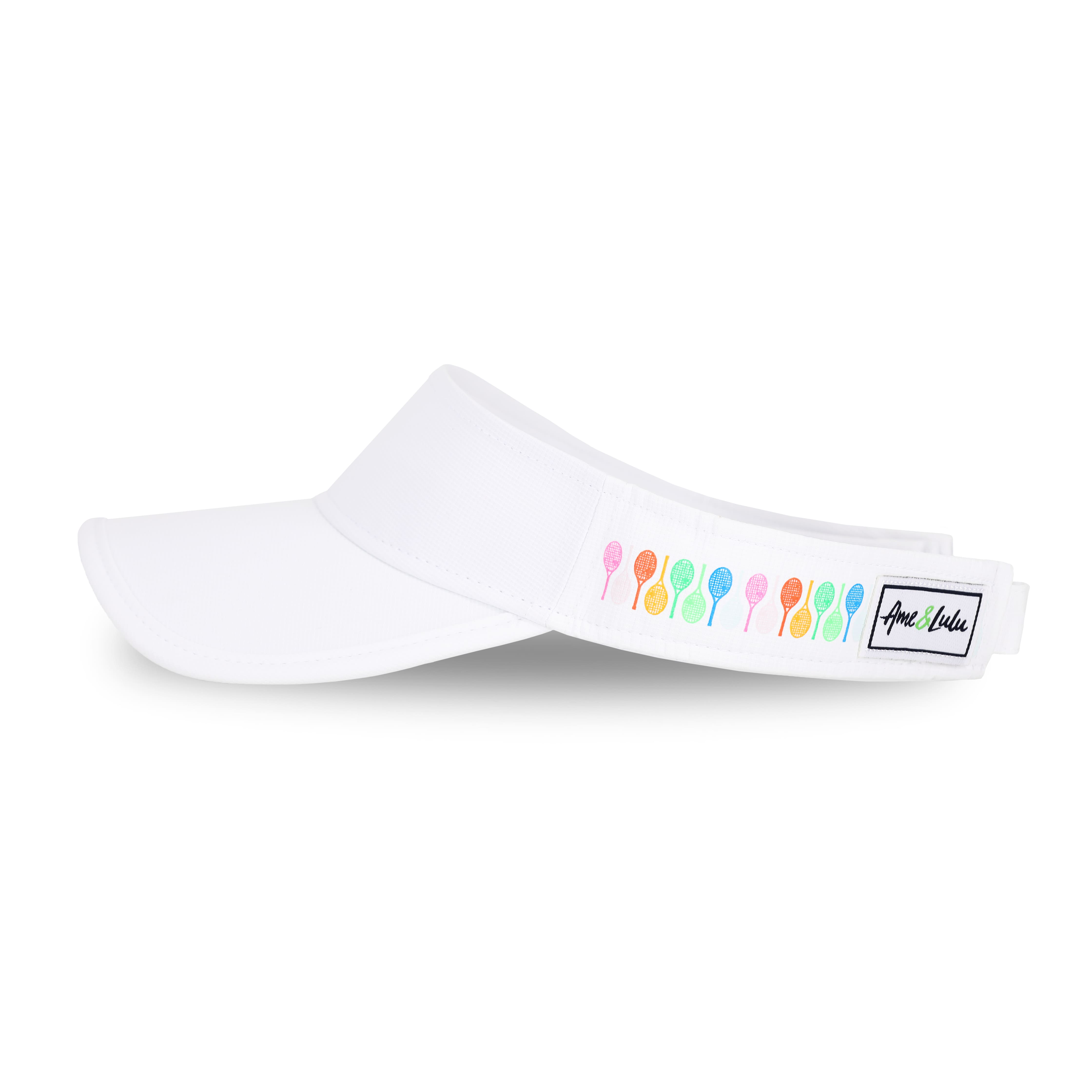 The Ame & Lulu Head in the Game Tennis Visor (Rainbow Racquets) has a rainbow of racquets on the hat in different colors.