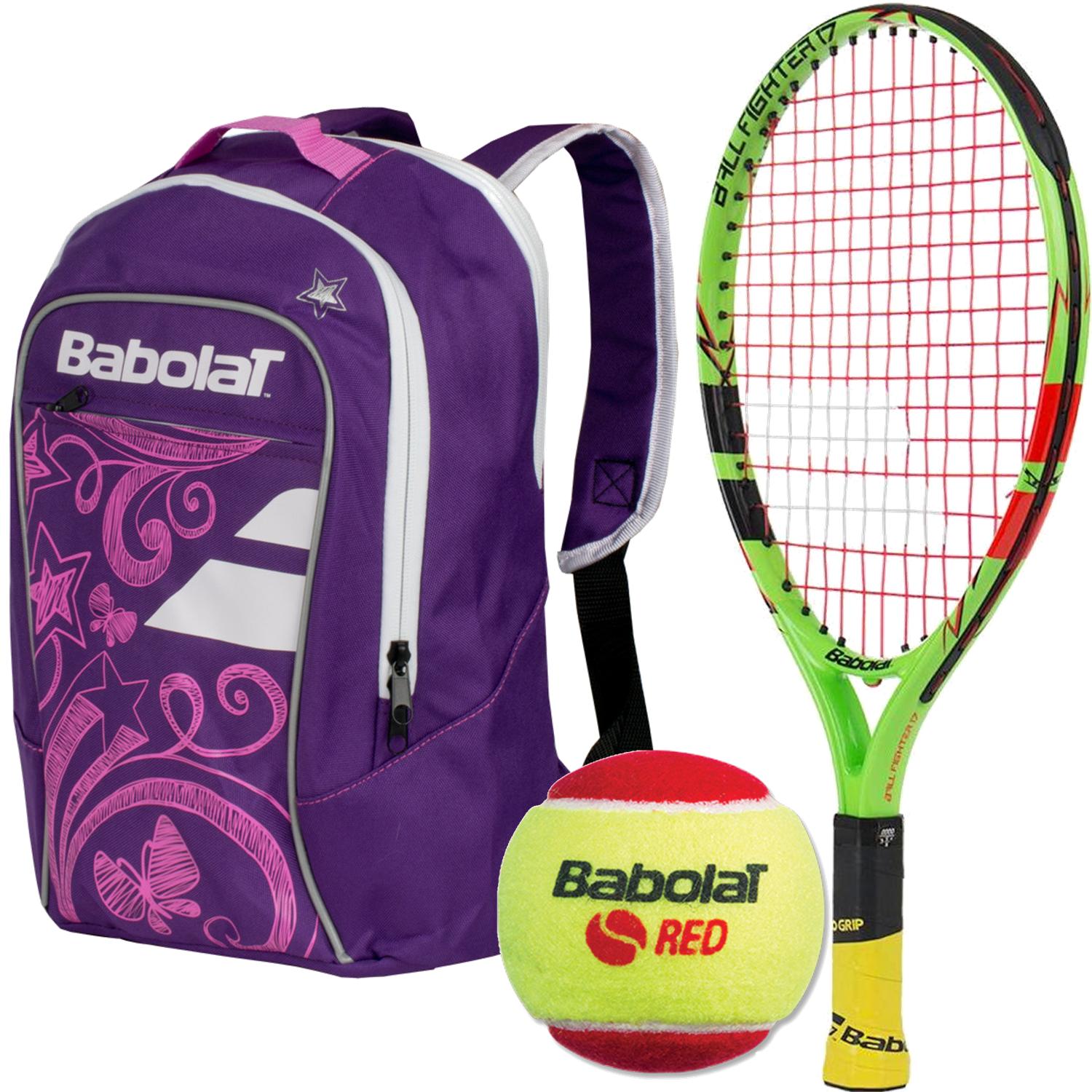 Included in this starter tennis bundle is one Babolat Ballfighter 17' Inch Junior Tennis Racket and your choice of a blue or purple junior tennis backpack.