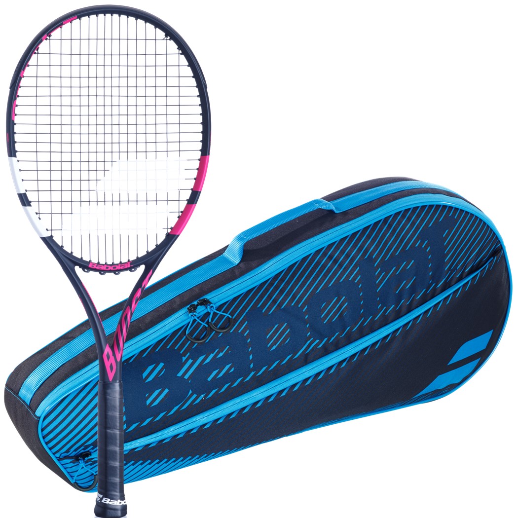 This tennis starter set includes (1) Babolat Boost Aero W pre-strung tennis racquet in your choice of grip size and (1) blue Babolat Club Essential tennis bag.