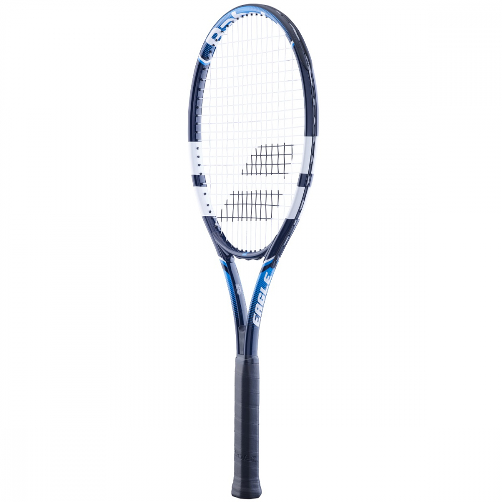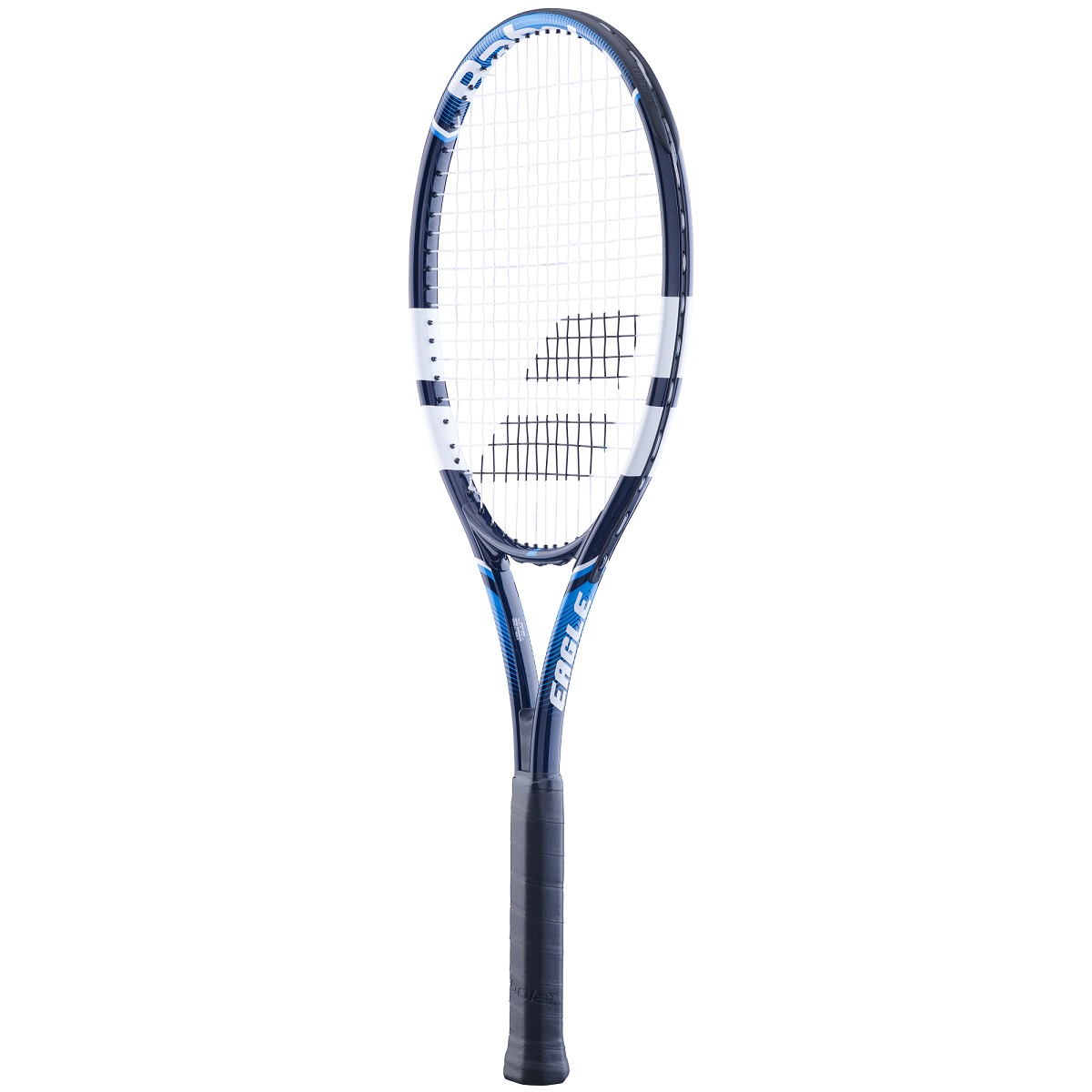 The Babolat Eagle Tennis Racquet (Black/Blue) will take your court game to the next level when you swing the Babolat Eagle tennis racquet. The aluminum construction encourages lightweight handling. The elliptic frame delivers an enlarged sweet spot for power and is prestrung for convenience, while the Uptake grip helps ensure comfort and control.