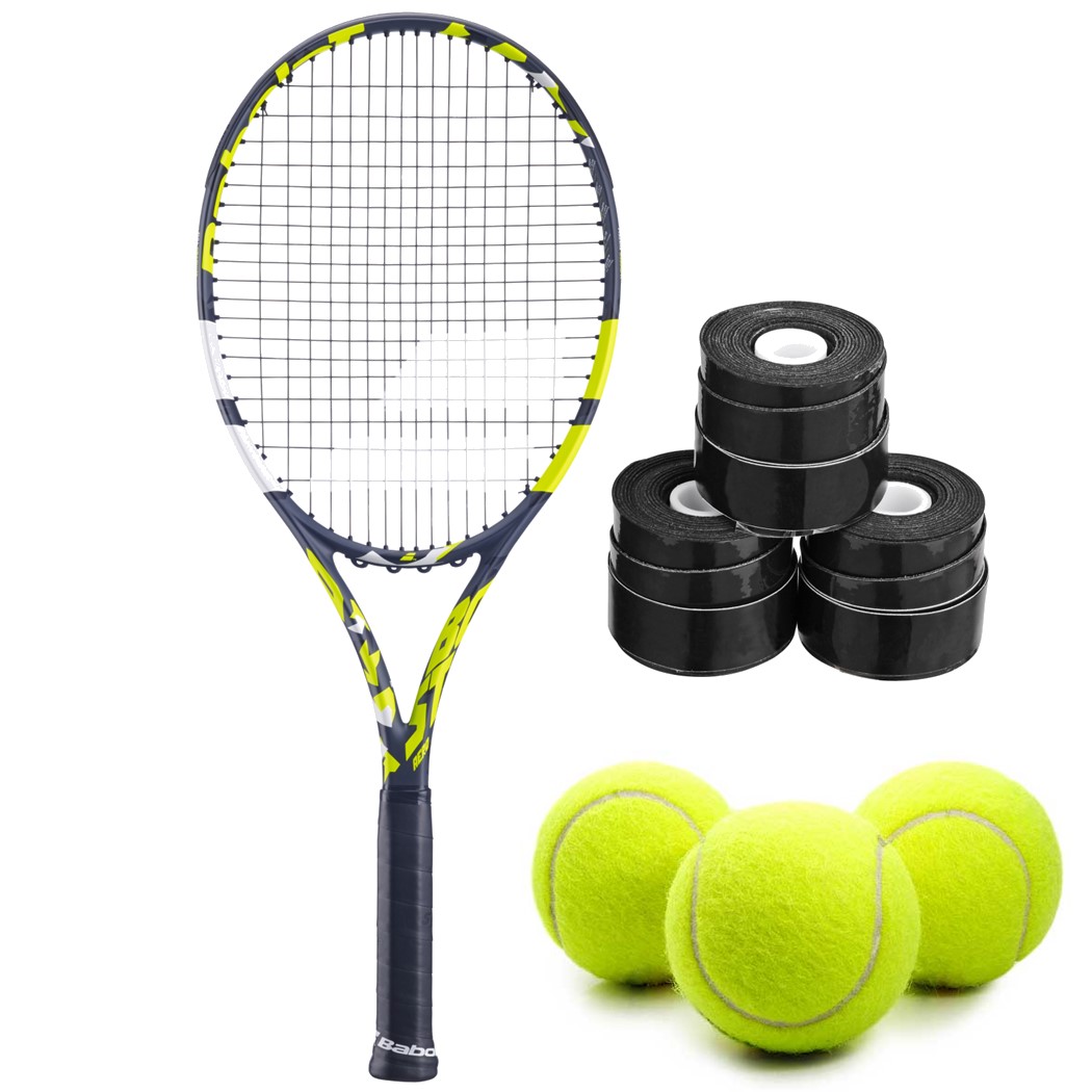 This Babolat Evo Player Pack includes (1) Babolat Evo Aero Yellow pre-strung tennis racquet in your choice of grip size, (3) black overgrips and (3) tennis balls.