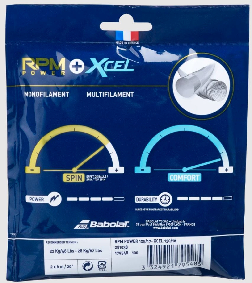 The RPM Power offers even more power and spin when coupled with the Xcel multifilament string. Dispose it on mains strings to optimize its benefit.