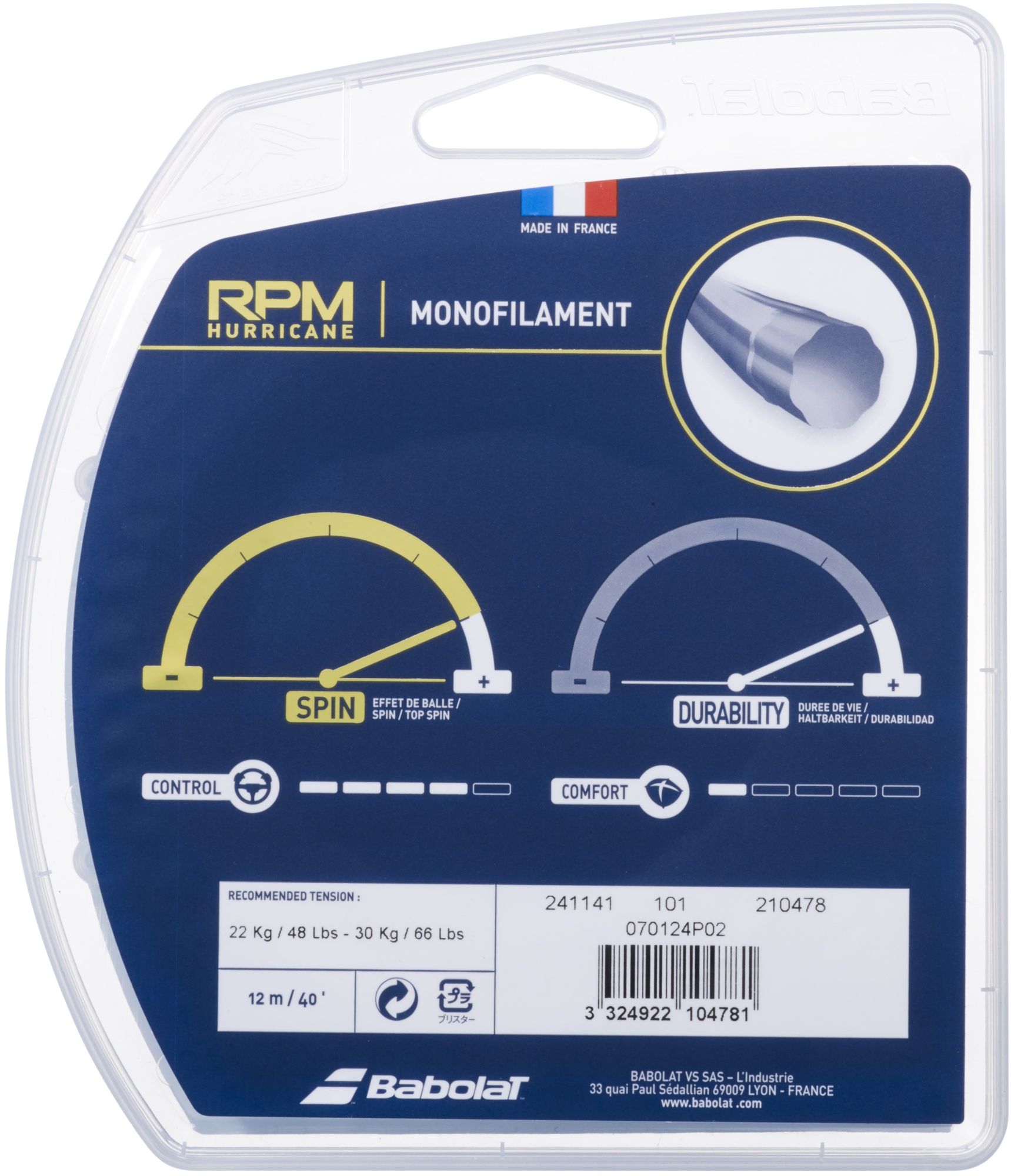 Control - As with all RPM strings, the RPM Hurricane provides a great control to get accuracy in all your shots. A special low-density co-polyester offers more softness. Ideal for players looking for more tolerance.