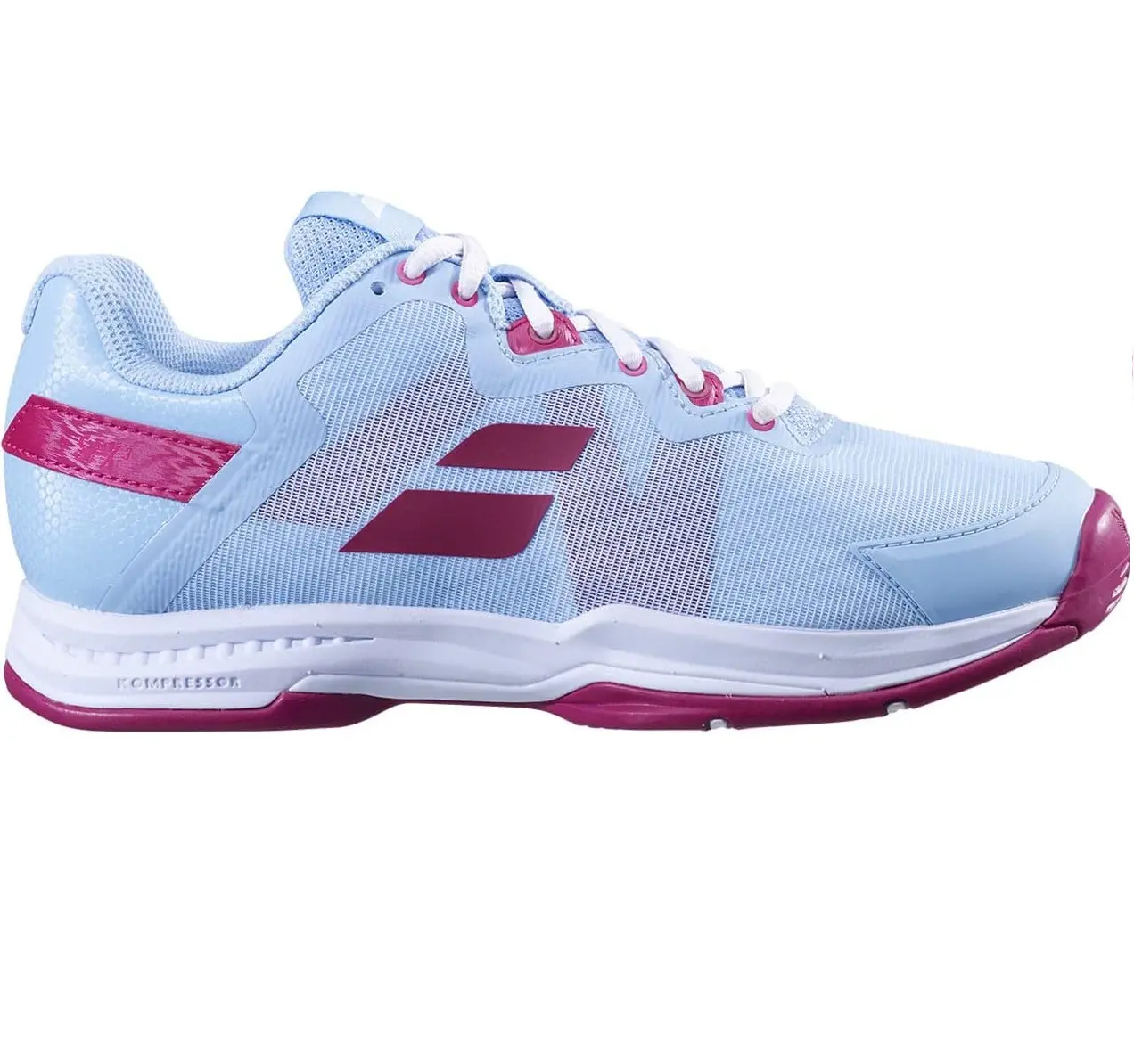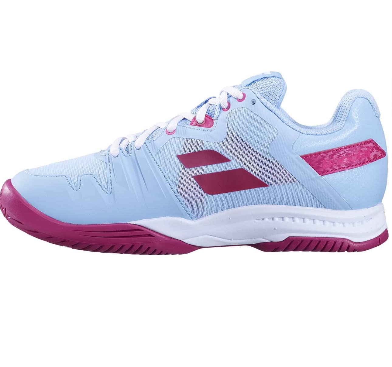 The Babolat Women’s SFX3 All Court Tennis Shoes (Clearwater/Cherry) ensures all the comfort you need on the court with a sole that is suitable for all surfaces. Babolat has pulled out all the stops to achieve this model’s performance — it feels like a real ‘slipper’! It’s the benchmark for comfort in the Babolat range. The upper has a one-piece construction with flexible mesh that ensures maximum breathability. Padded mesh tongue Protective insert at the tip and on the inside integrates into the lacing for greater protection and stability.