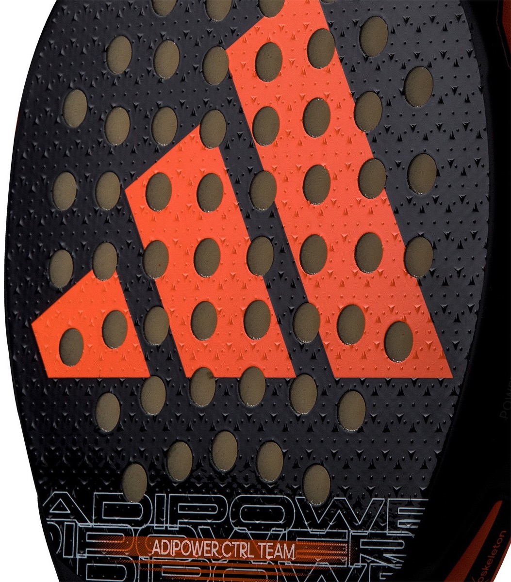 The Adidas Adipower CTRL Team 3.3 Padel Racket (Black/Orange) features a Dual Exoskeleton, a dual insertion of 100% carbon nerves within the structure that reinforce the core and frame of the racket. Materials include a fiber glass face and frame on the contour/edge of the racket, helping its resistance at impact with the ball.