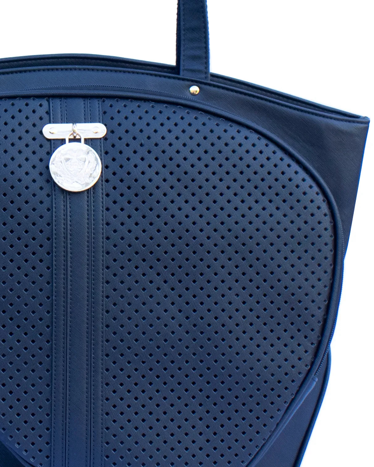 The Court Couture Cassanova Perforated Tennis & Pickleball Bag stands out with a distinctive perforated design, seamlessly blended with the timeless stripes adorning the front of the bag.