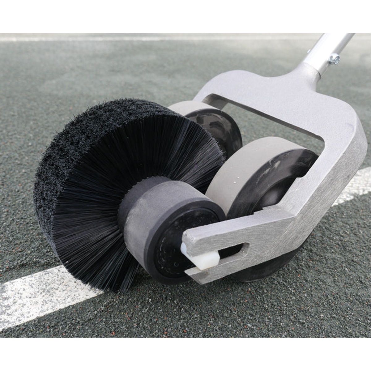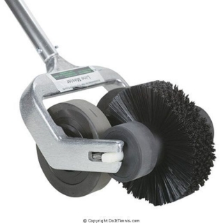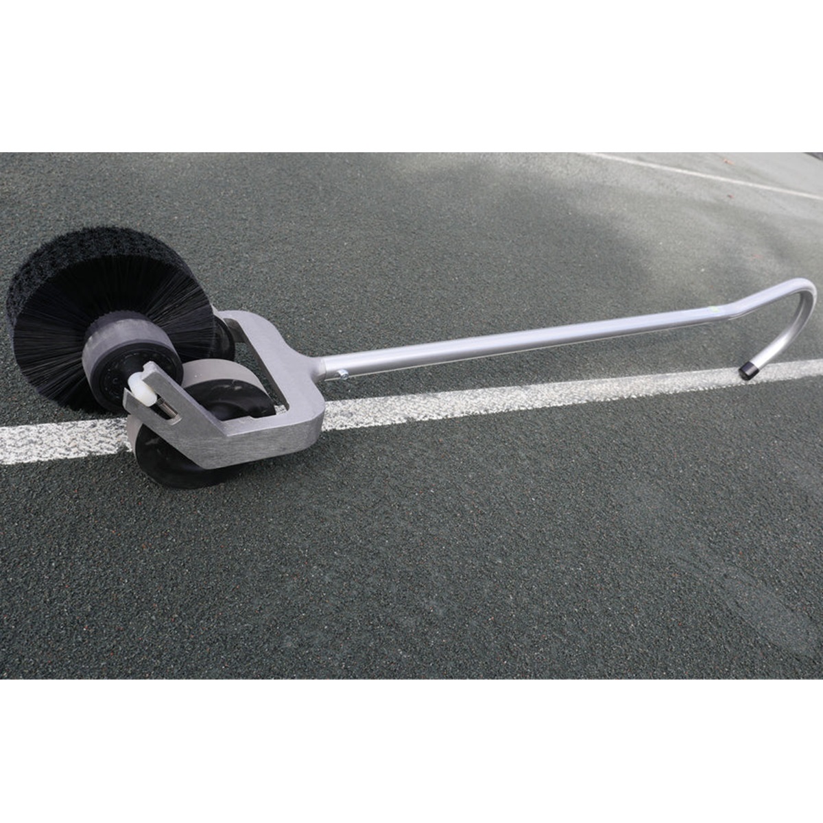 The Courtmaster Line Master Line Sweeping Machine is a line sweeping machine that improves the appearance of a freshly-swept court in half the time it would take to sweep lines with a broom. This helps minimize delays for line sweeping during tournaments. Features include a curved handle, all-aluminum construction for rust-free outdoor use, positive locking brush action and a perfectly textured brush for an easy-to-use yet firm brushing action. The angle allows the brush to dig in and remove those hard-to-clean areas that require more pressure. The Line Master cleans lines as quickly as you walk. Brushes are available with coarse or fine bristles. The Line Master is designed with a rotating synthetic bristle brush mounted between friction-driven rubber rollers.
