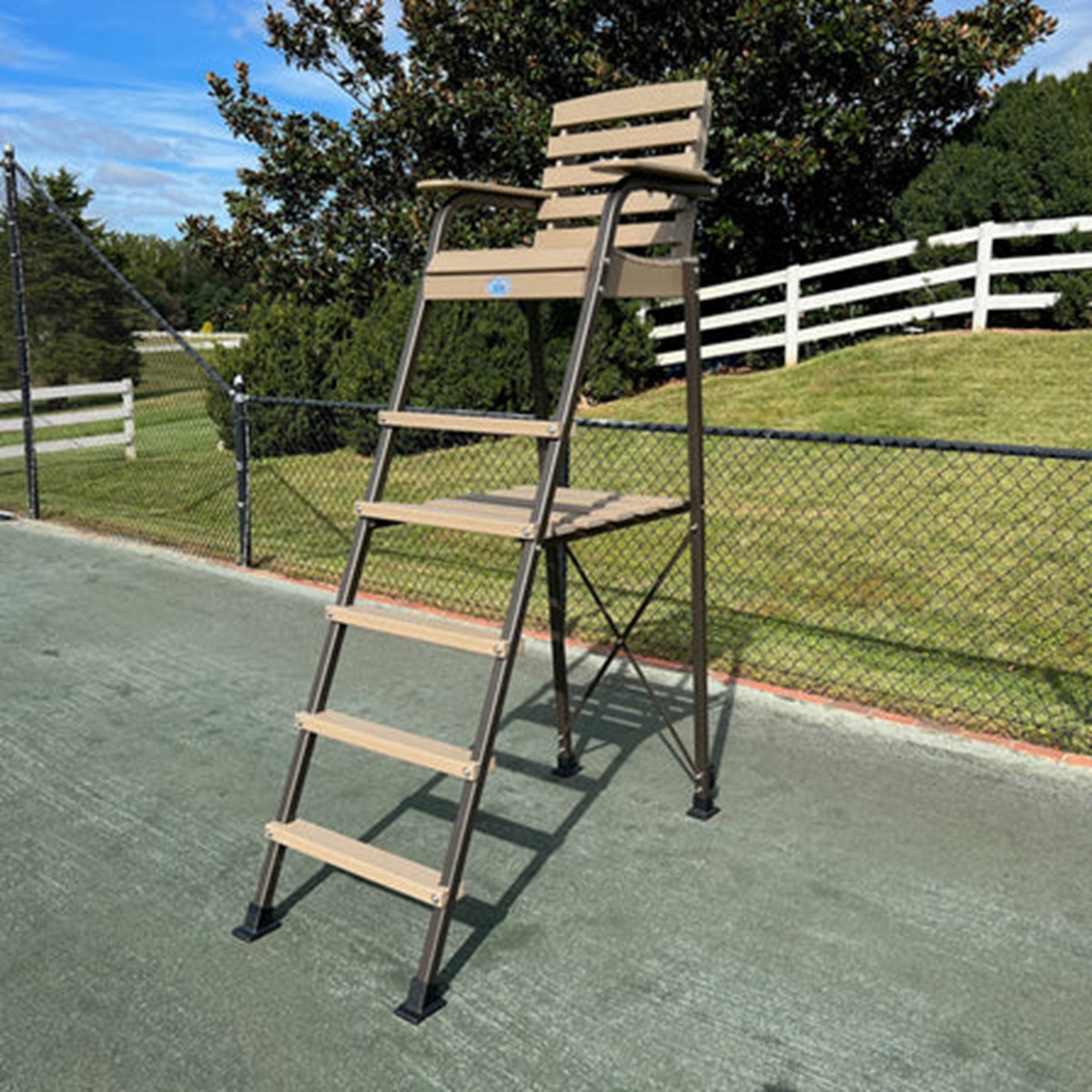 The Har-Tru Premier Tennis Umpire Chair has been designed to meet ITF (and USTA) tournament regulations worldwide. Manufactured in the USA and built for both indoor and outdoor use, the Premier Umpire Chair has an industry-leading 3-year warranty. The heavy-duty, all-weather components include a premium-grade aluminum frame with rounded corners for safety, durability, and comfort. The frame is powder coated with a durable acrylic finish that will provide years of service and a long-lasting good look. The seat, steps and platform are all constructed of high-grade HDPE poly lumber for strength, durability, comfort, and low maintenance. Solid to the core, UV protected, and virtually indestructible, the poly lumber is made in the U.S.A. and is 100% recyclable, which means a healthier environment for you and the rest of the world. Weather-resistant stainless-steel hardware is used throughout.