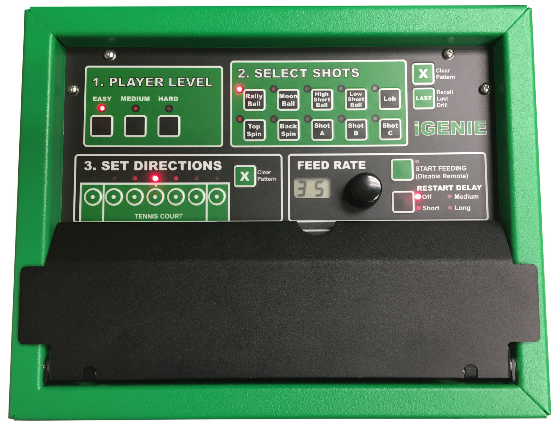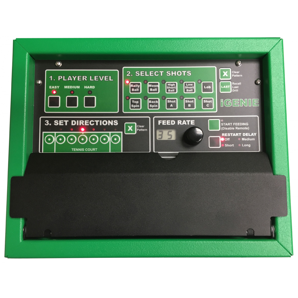 When using the iGENIE ball machine, you can leave the lower door of the remote box closed. However if you would like to access more advanced features like Random you can simply open the lower door. By lowering the bottom door you gain the ability to adjust the height, speed, spin, and delay of the shot.