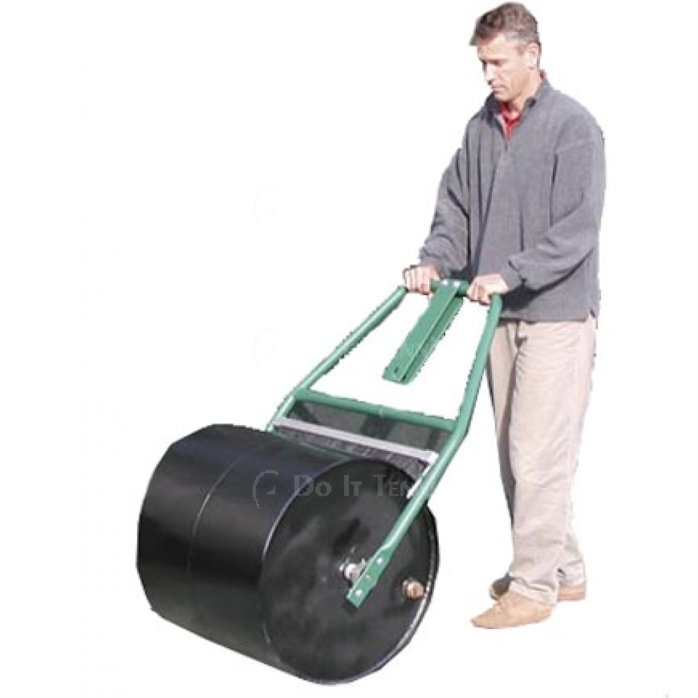 The two 12” wide by 24” high independently turning drums can be water filled to add weight. This roller can be pushed or towed with its dual-purpose handle and can be turned on the court without tearing the surface. A scraper brush is included for removing any build-up on the drum.