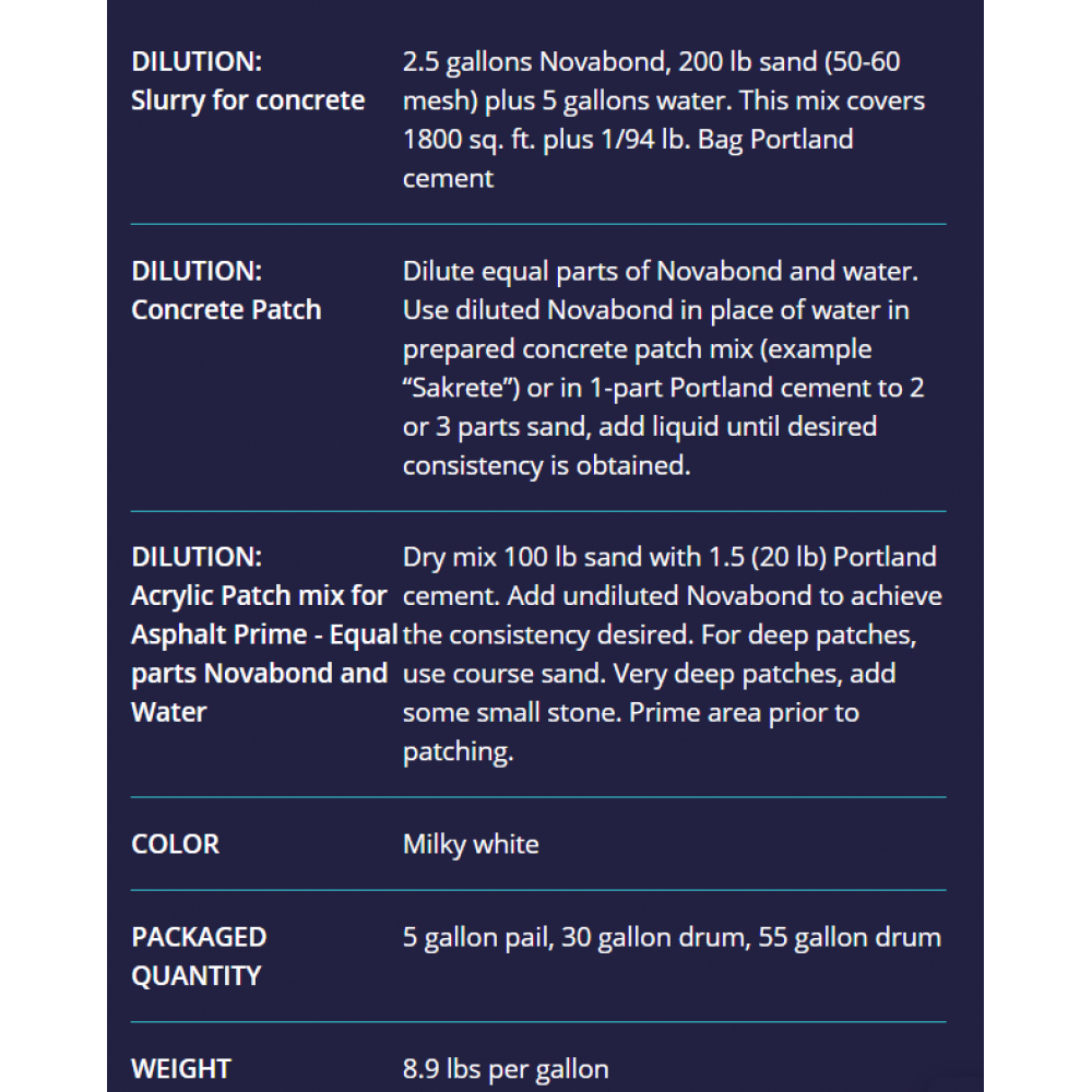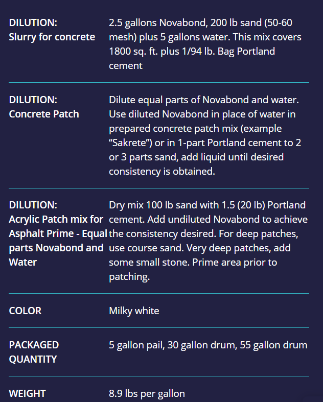 Dilution (Acrylic Patch mix for Asphalt Primer): Equal parts Novabond and Water. Dry mix 100 lb sand with 1.5 gallons (20 lb) Portland cement. Add undiluted NOVABOND to achieve the consistency desired. For deep patches, use course sand. Very deep patches, add some small stone. Prime area prior to patching.