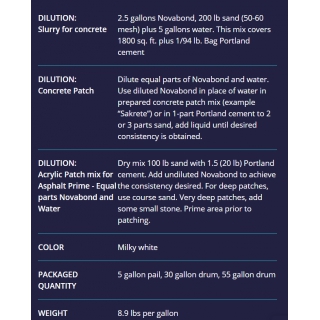 Dilution (Slurry for concrete): 2.5 gallons NOVABOND, 200 lb sand (50-60 mesh) plus 5 gallons water. Above mix covers 1800 sq. ft. plus 1/94 lb. Bag Portland cement