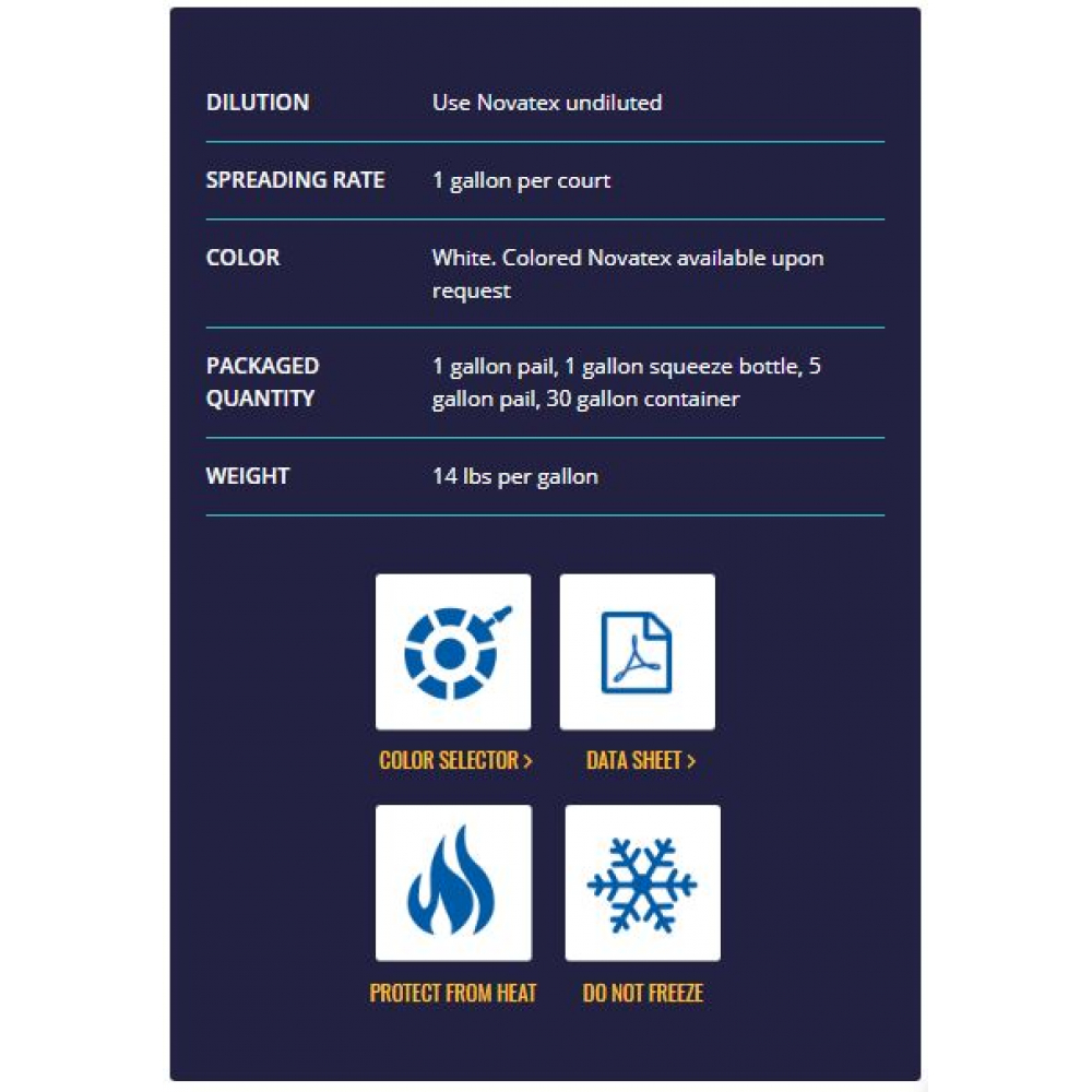 The Nova NoveTex Textured Tennis Court Line Pain (1 Gallon Pail) is a textured white line paint. NovaTex lines are brilliant, sharply defined and add a great deal to the overall appearance of the tennis court. The lines are “the frosting on the cake”.