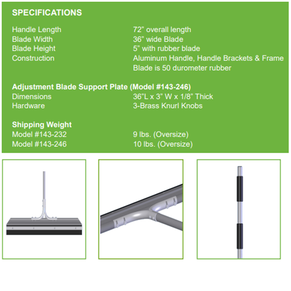 The Har-Tru Super Squeegee Tennis Court Tool is a contractor tool specifically designed to spread acrylics and adhesives during hard court construction and resurfacing. It is also used for for pulling water off of a hard surface. It is a revolutionary court drier with an adjustable angle of application blade. Uses extruded rubber for easy replacement. 50 durometer rubber blade. 6’L, 36’ W. 9 lbs.