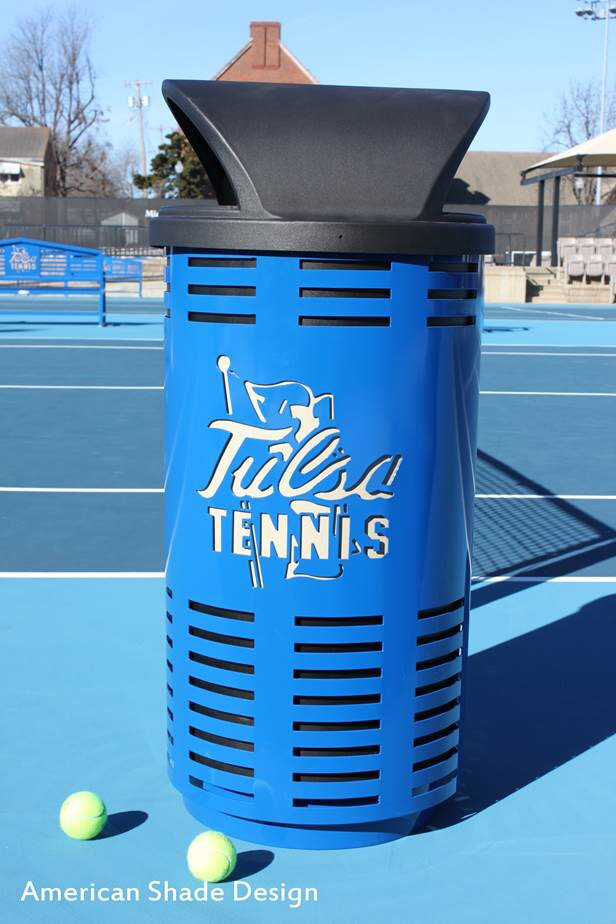 Custom Designer Logo Stadium Trash Container, with your custom Logo laser cut into the metal on two sides.