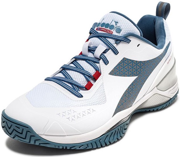 Diadora Men's Blushield Torneo 2 All Ground Tennis Shoes (White/Oceanview/Salsa) upper is made of SuprellTech, air mesh and D-Skin, for excellent stability, breathability, and comfort, with soft lycra lining with non-slip design. The DNATTIVO insole is removable, the midsole is made of light EVA and arch reinforcement to improve stability and Blushield technology at the metatarsal, and the outsole is made of rubber with special wear-resistant Duratech 5000 compound. The large stabilizer behind the heel protects the ankle and supports it; thanks to the Diadora Blushield technology and the DNATTIVO insole, it cushions and protects from impact.