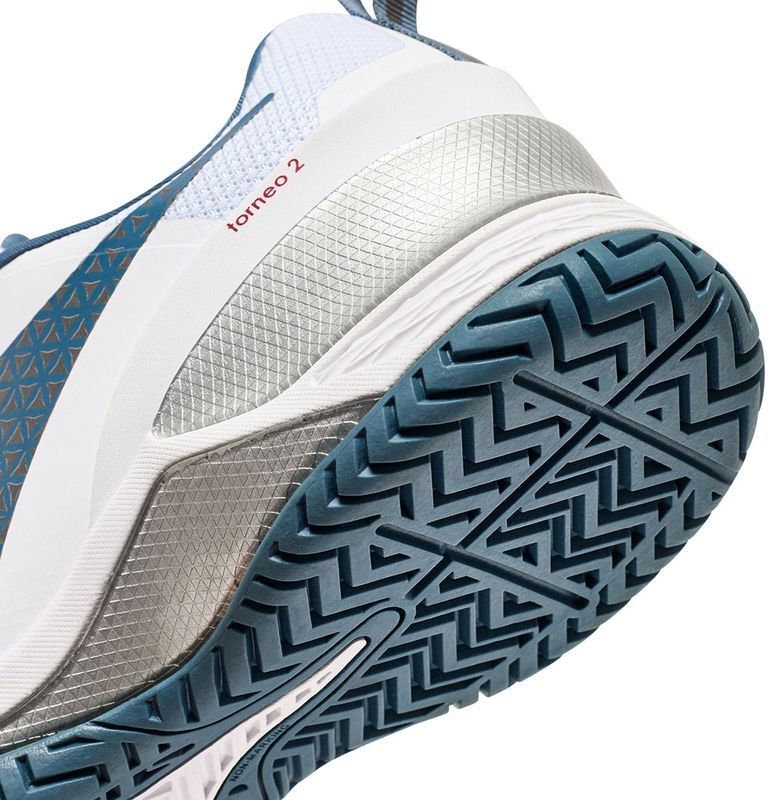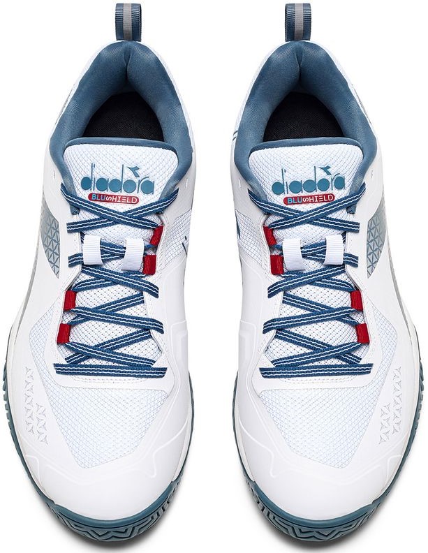 The Diadora Men's Blushield Torneo 2 All Ground Tennis Shoes (White/Oceanview/Salsa) are designed for all-level players, for use on hard surfaces or clay courts. Ideal for those who prefer classic lacing with maximum adjustment.