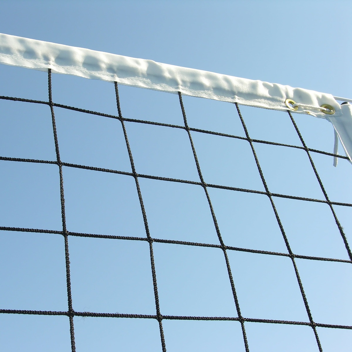 The Douglas Power Volleyball Net (39" x 32') Cable Top & Bottom with a VB-1200 competition net measures 39” in height and 32’ length meeting the USVBA standards. The black netting is 3.0 mm in standard 4” squares and the perimeter bands are constructed from 2.5” wide 20 oz white vinyl. Nets are braced with fiberglass dowels. The top cable is 41’ in length and is vinyl coated steel with a 3600 lb break strength. Cable ends are double pressed for strength. These weather treated quality nets are great for indoor or outdoor use. VB-1200 comes wit a bottom band that has a 38’ steel cable with a 2400-lb. break strength.
