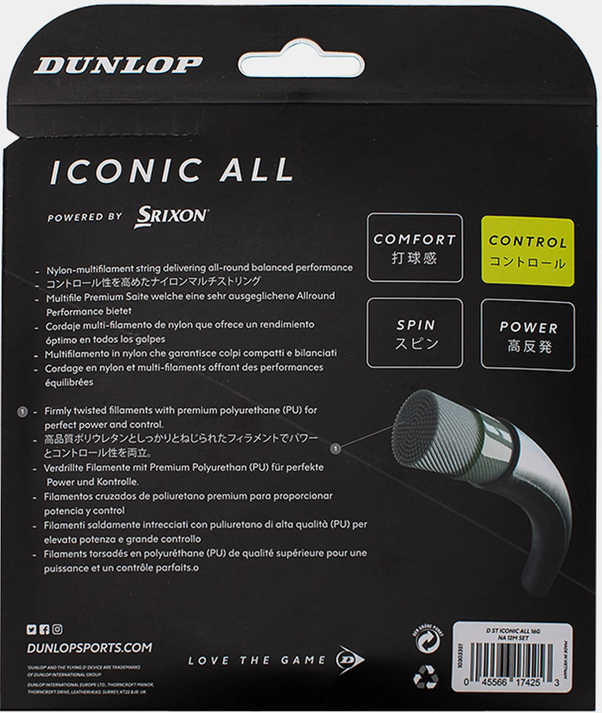 The Dunlop Iconic All Tennis String Set is one of the most comfortable and arm-friendly strings on the market. In addition to its soft feel, this string is loaded with power. As a result, it delivers easy depth on compact strokes, with blistering power available on full swings.