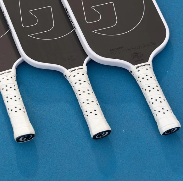 The Gamma Honeycomb Pickleball Grip has a perforated surface that enhances grip and connection with the paddle.